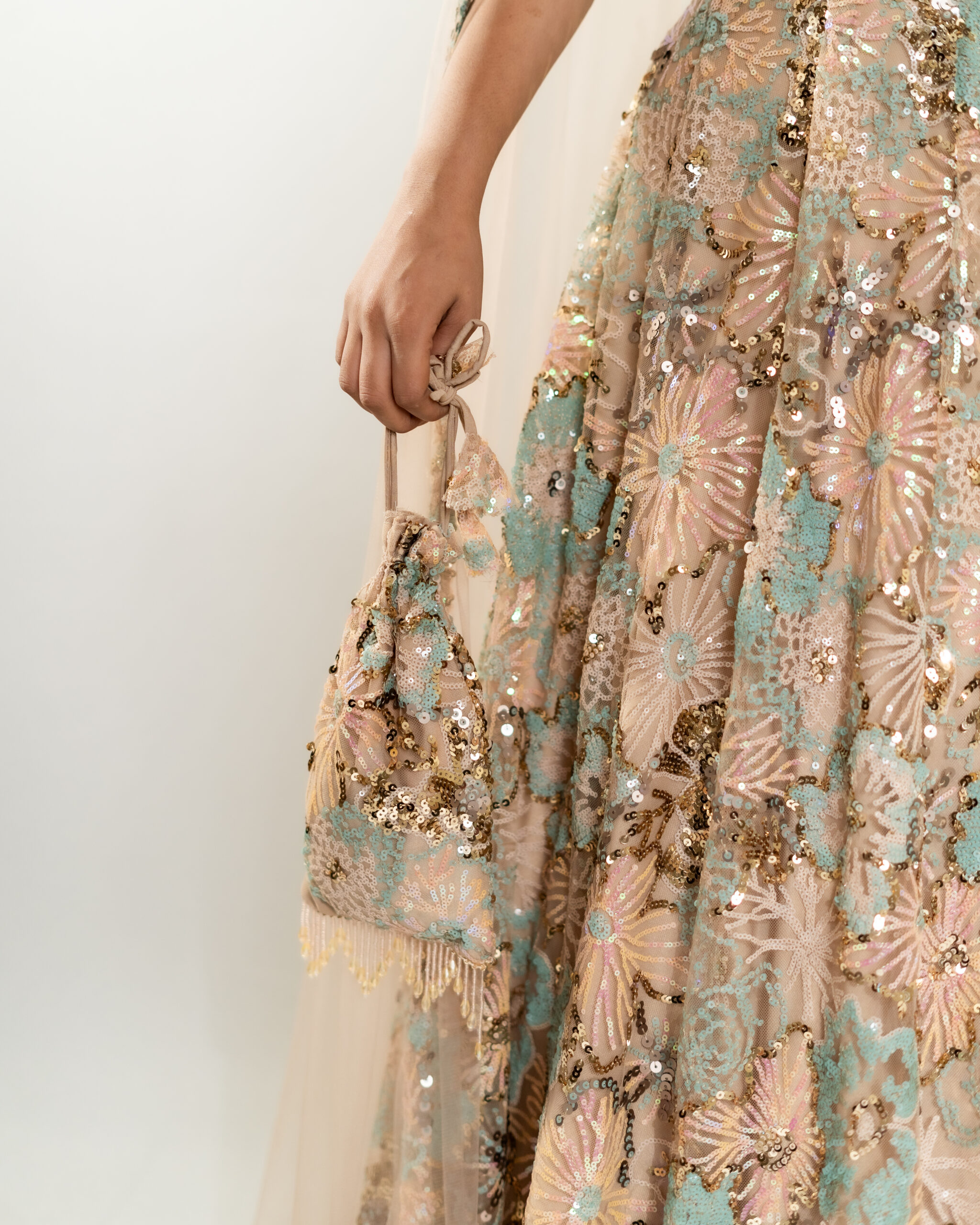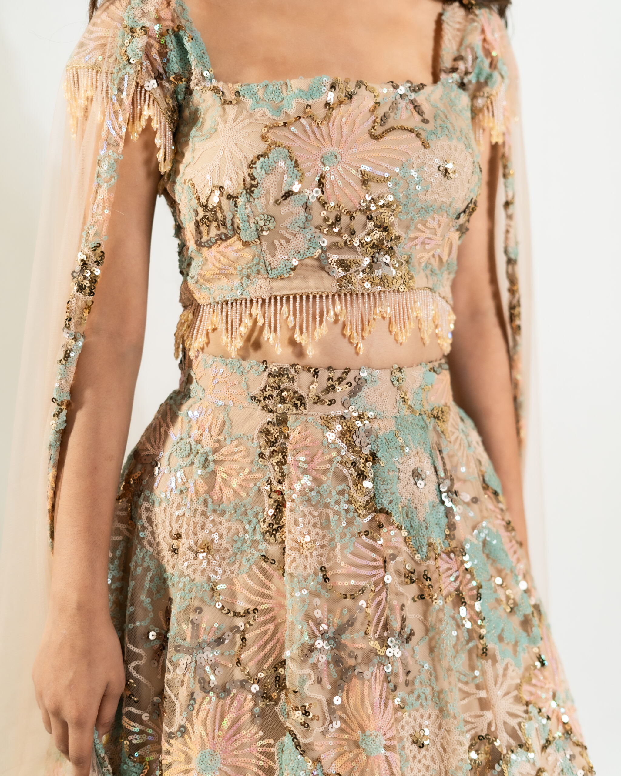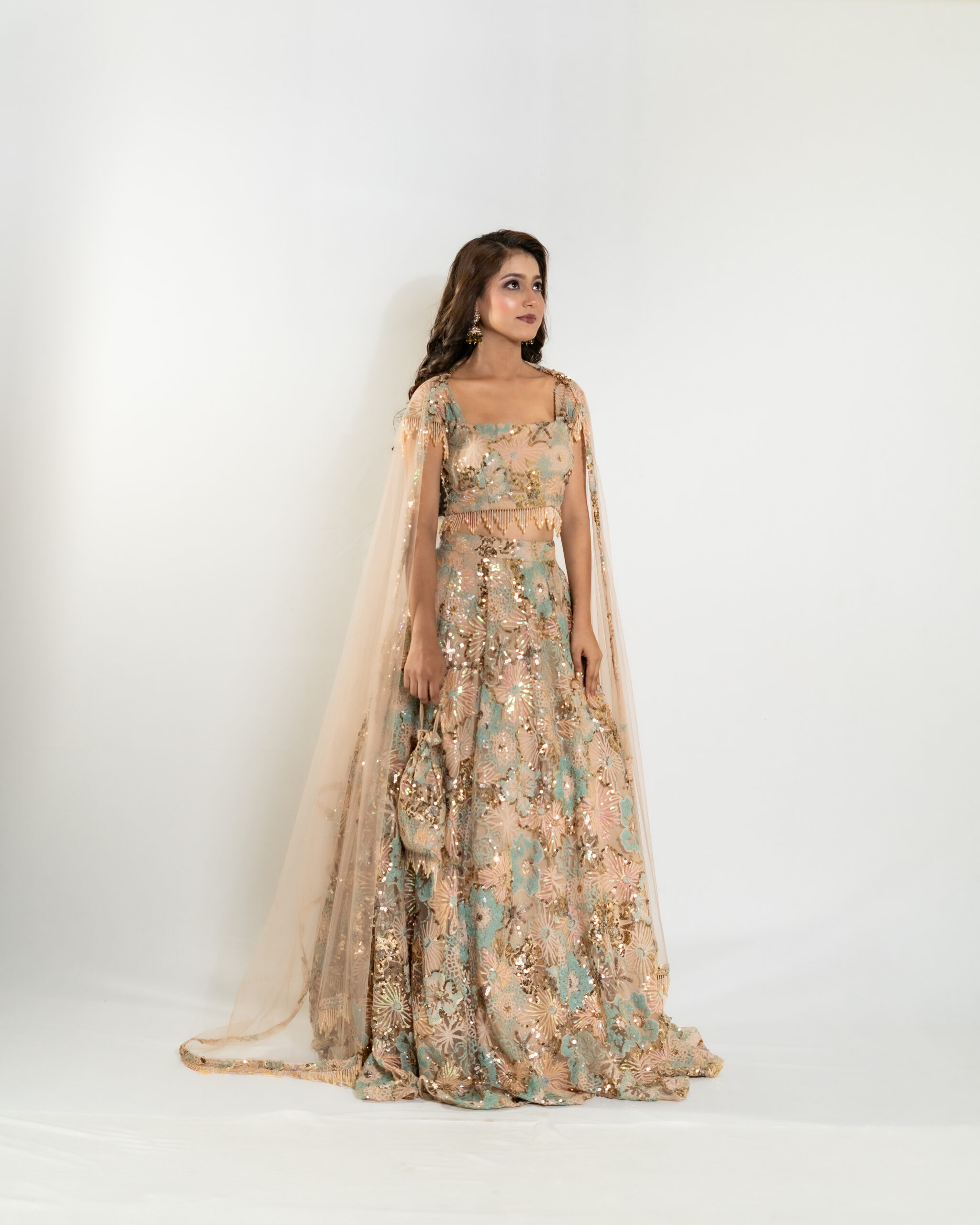 Aureline captures the essence of golden light and soft aura. This pastel peach tan colur with turquoise blue floral sequin lehenga features a crystal-bordered dupatta and a designer blouse with delicately embellished crystal cap sleeves. The ensemble is completed with a complimentary matching potli, making Aureline a perfect choice for sunlit celebrations, radiating evening grace, elegance, and luminous charm with every step.