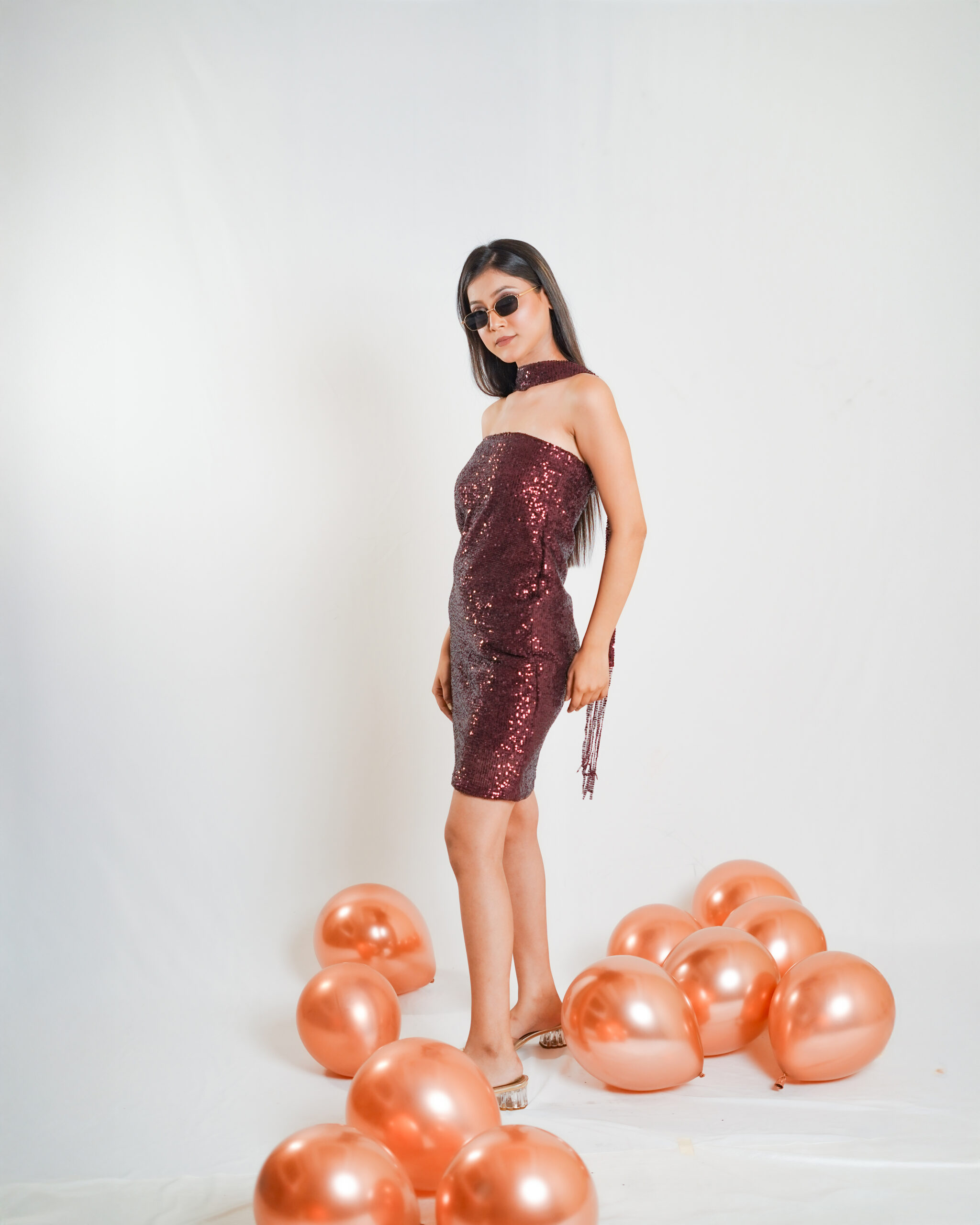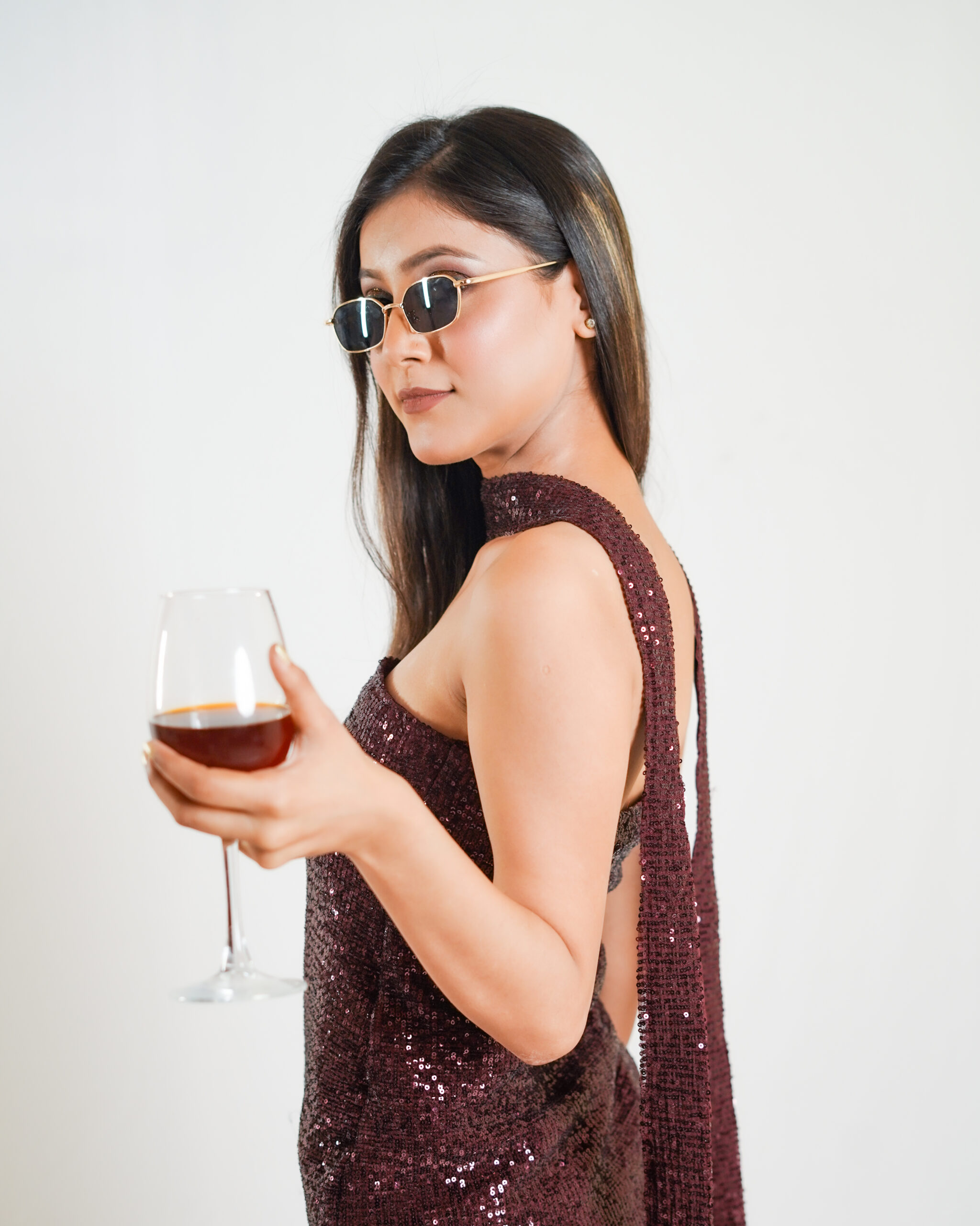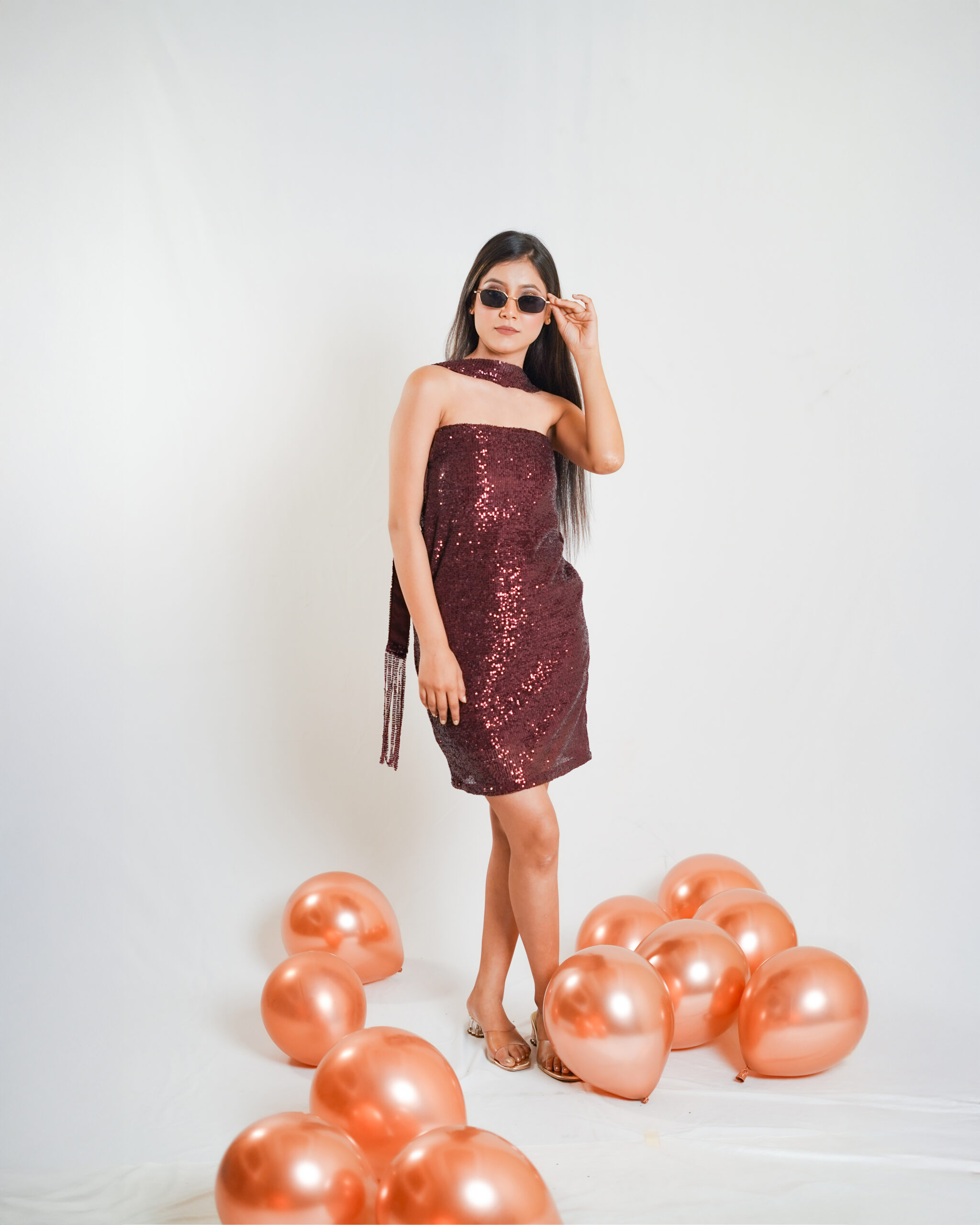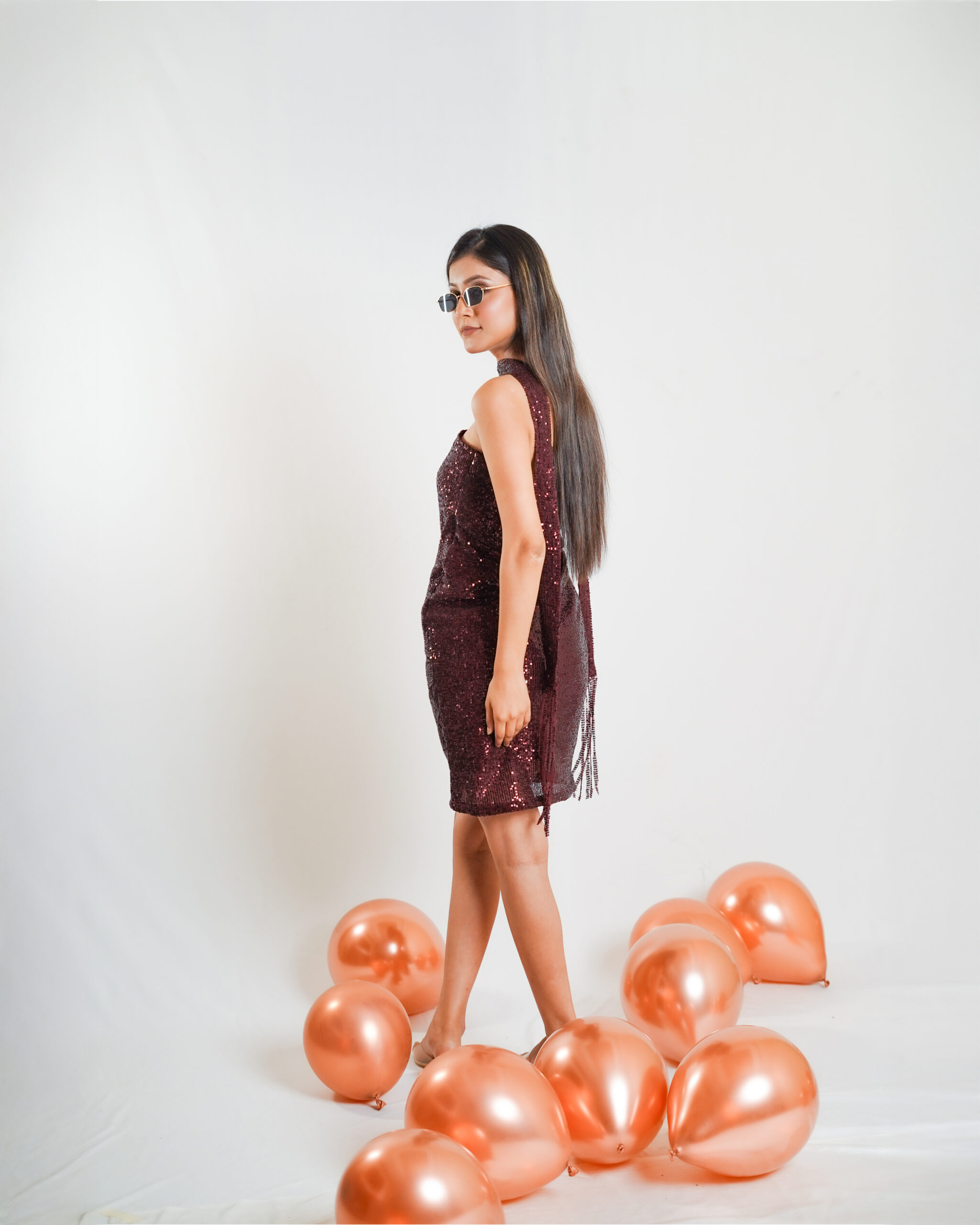 The Burgundy Sequin Dress with Stole radiates rich elegance with deep red sequins, complemented by a matching stole—ideal for sophisticated evenings, formal events, and graceful celebrations.
