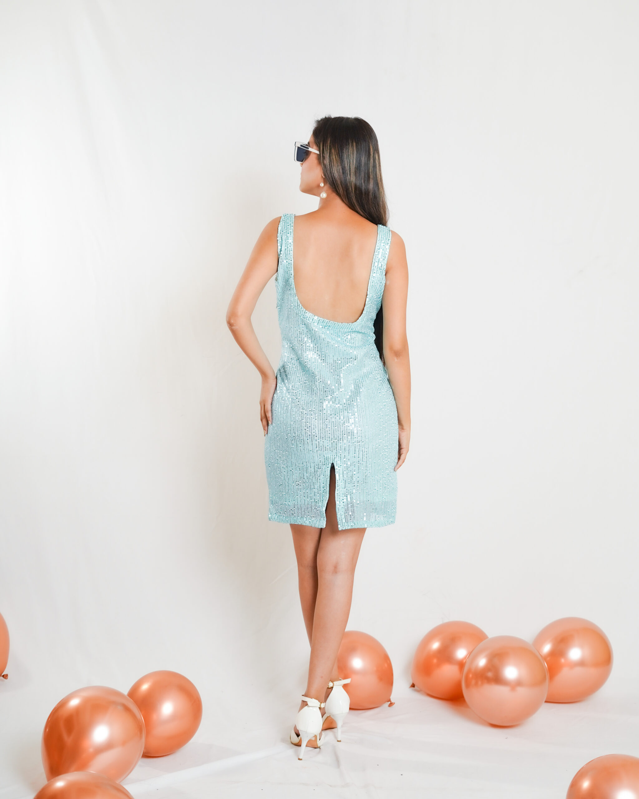 The Frozy Blue Sequin Mini Dress sparkles with eye-catching blue sequins, featuring a sleek, form-fitting design that’s perfect for evening events, parties, or any occasion demanding a touch of glamour.