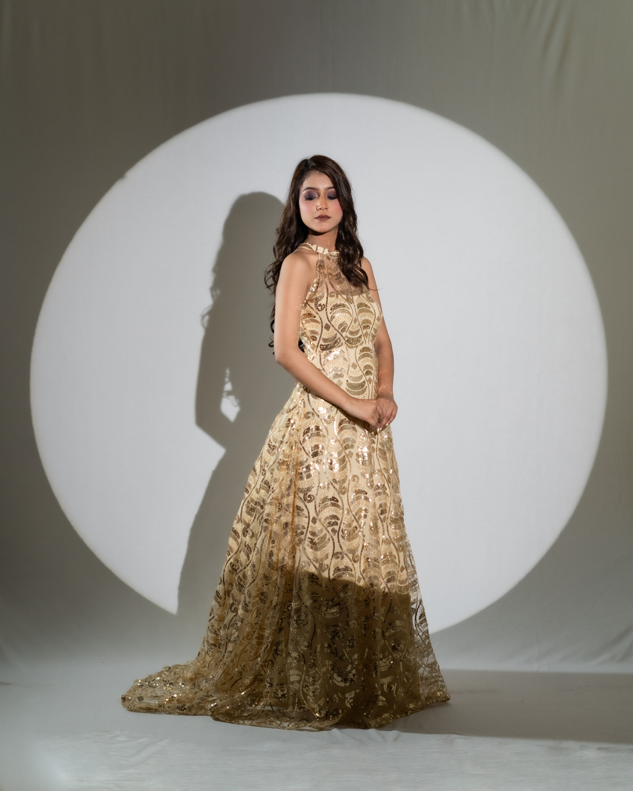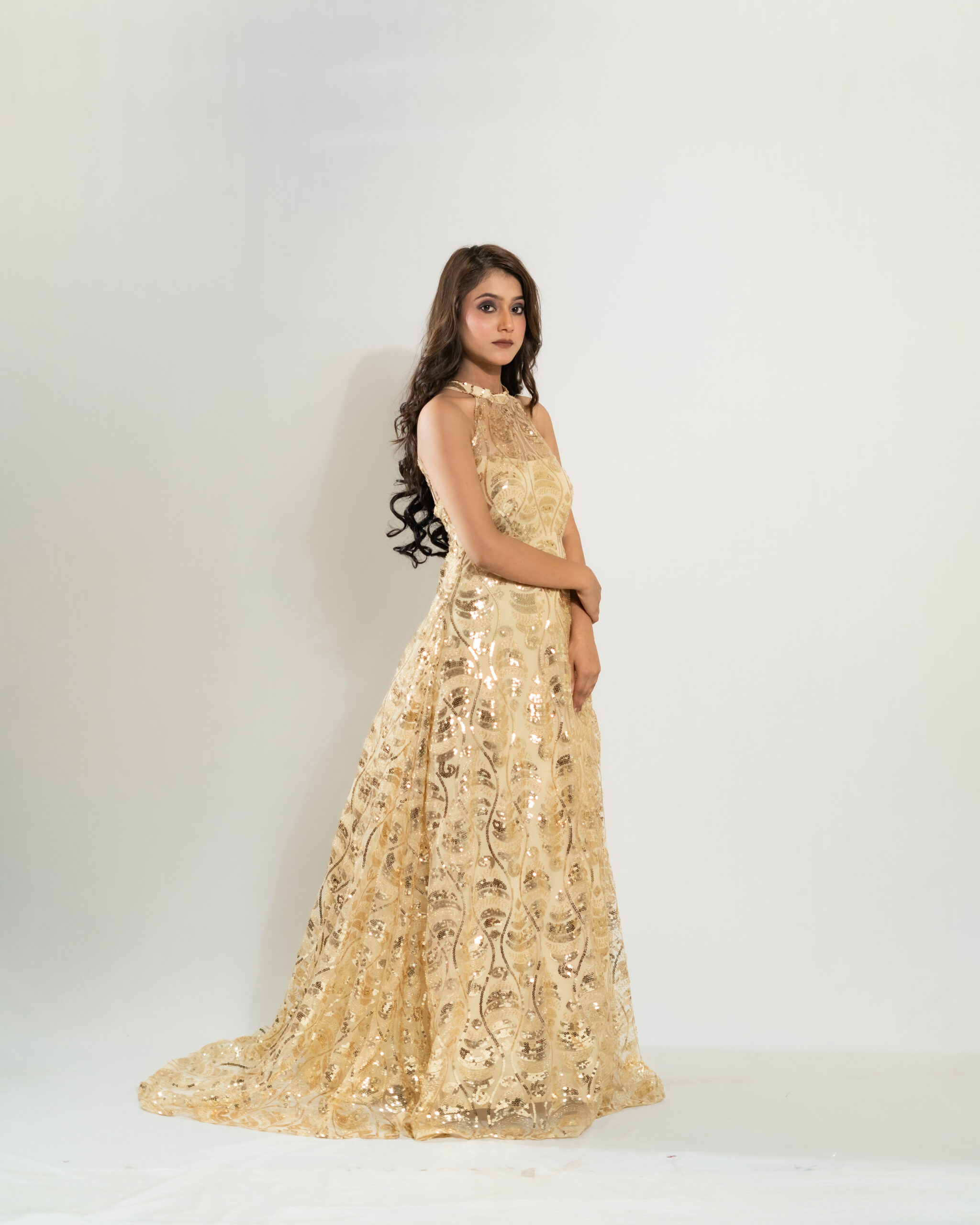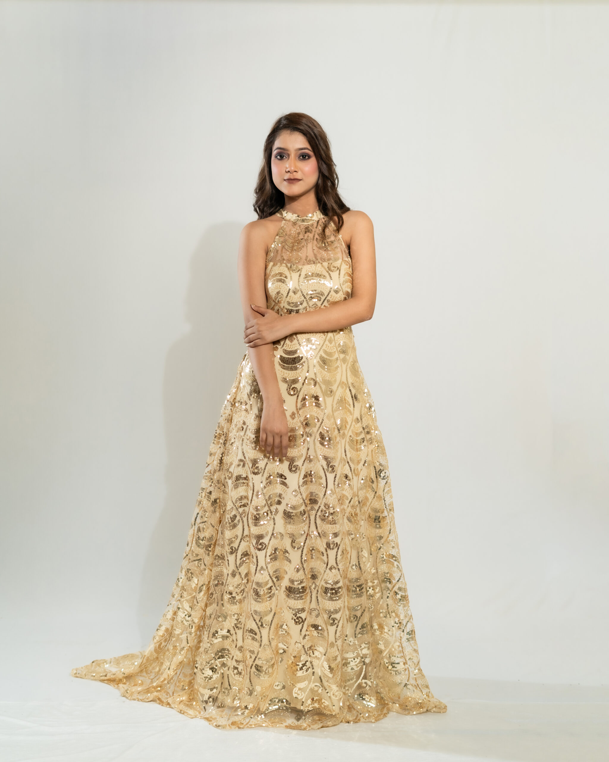 The Glitz & Groove Gown is a celebration of golden elegance, crafted in a graceful trail silhouette that exudes drama and sophistication. Featuring a net base adorned with dazzling sequin and cutdana embroidery, this gown captures radiant charm and intricate craftsmanship. A flawless blend of tradition and modern luxury, it’s perfect for evening soirées, sangeets, or cocktail nights. This timeless design ensures you’ll be the star of any celebration, commanding attention with every step.