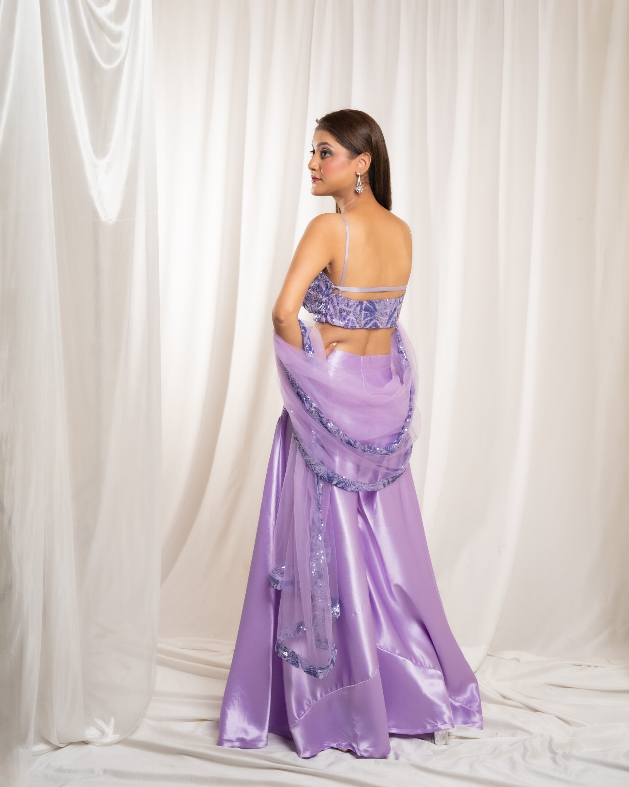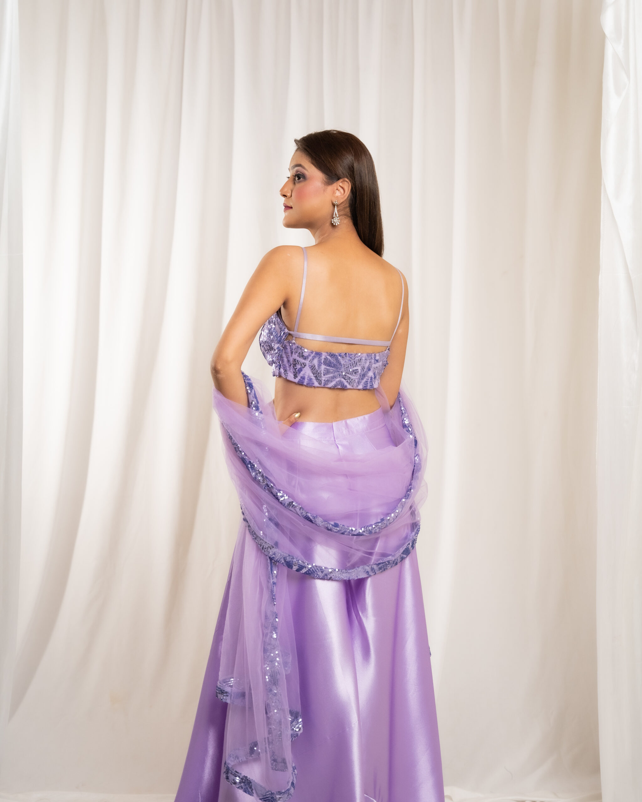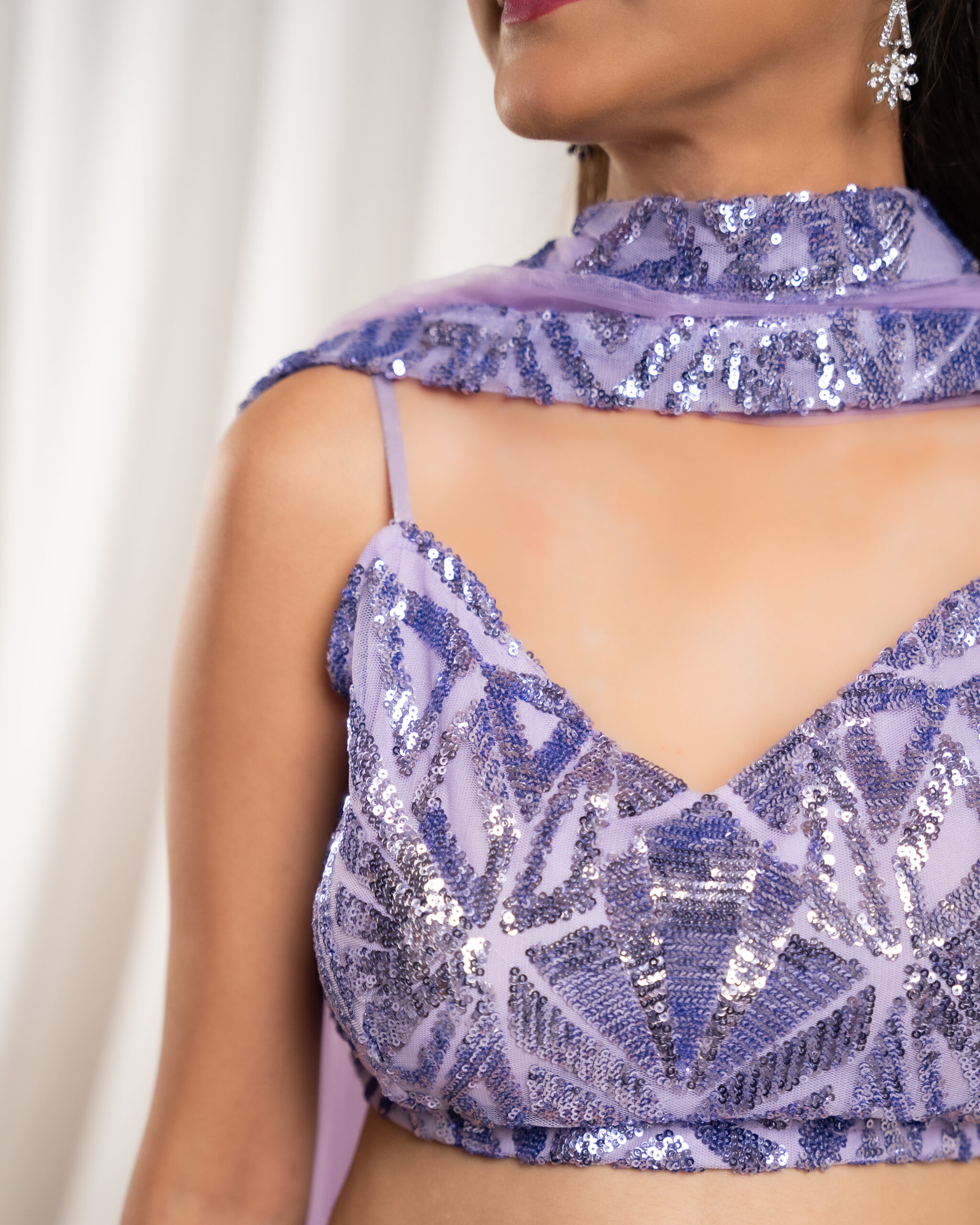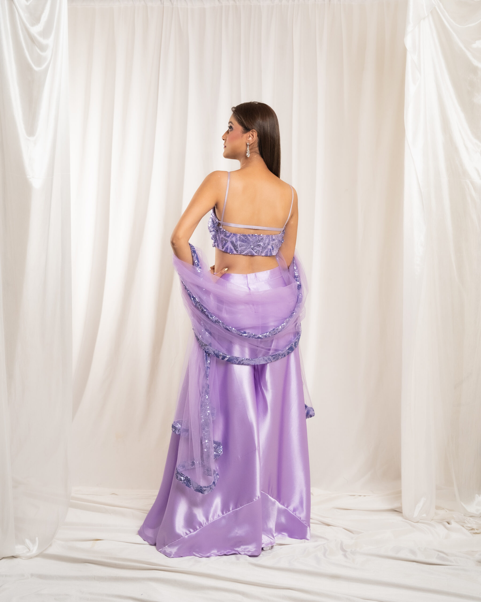 A soft and elegant lavender lilac Indo-Western set featuring a sequin-embroidered top paired with sleek lavender satin bottoms. Completed with a delicate lavender net dupatta adorned with a heavy matching sequin border, this ensemble radiates charm and sophistication—perfect for daytime festivities, engagement parties, or modern celebrations.