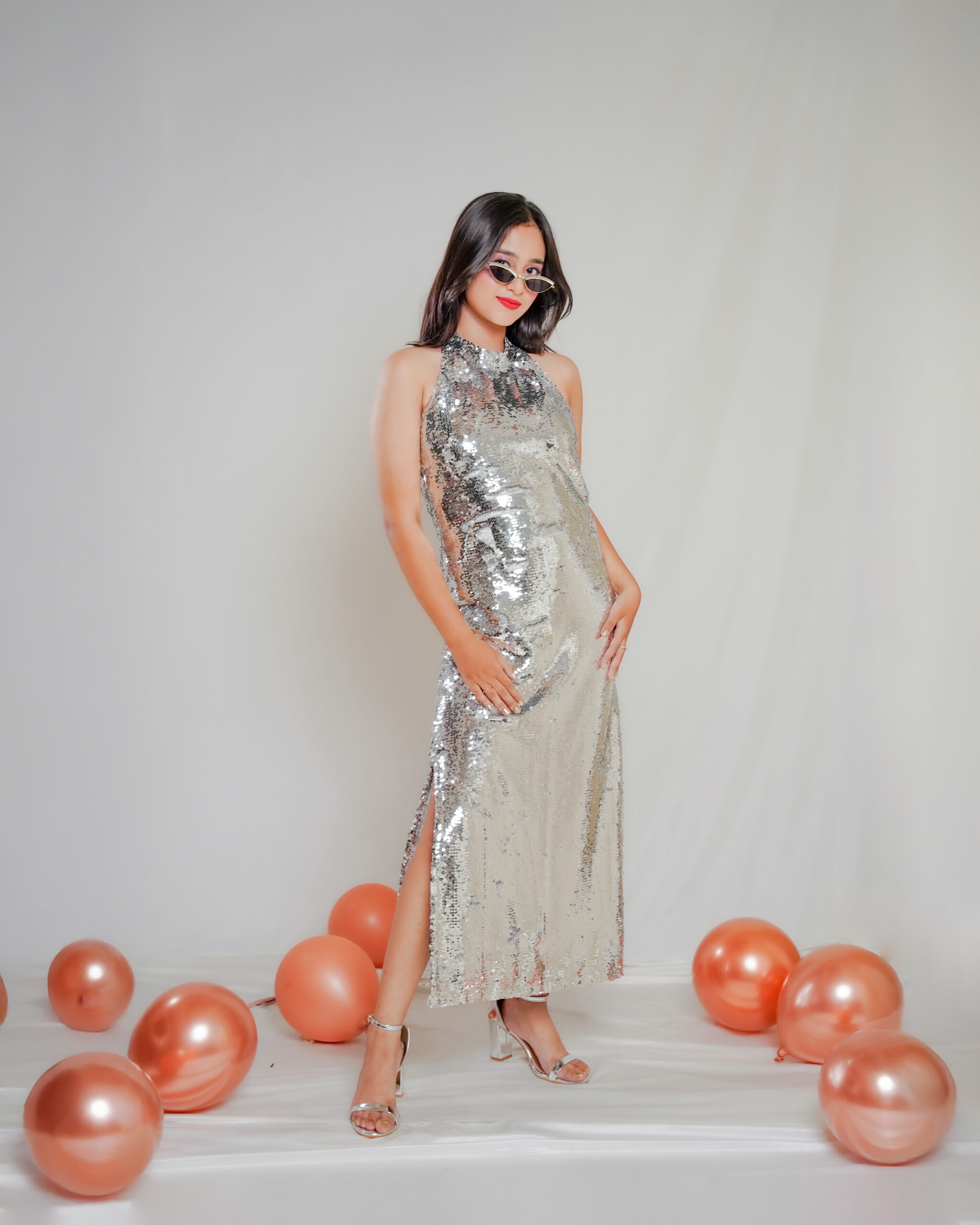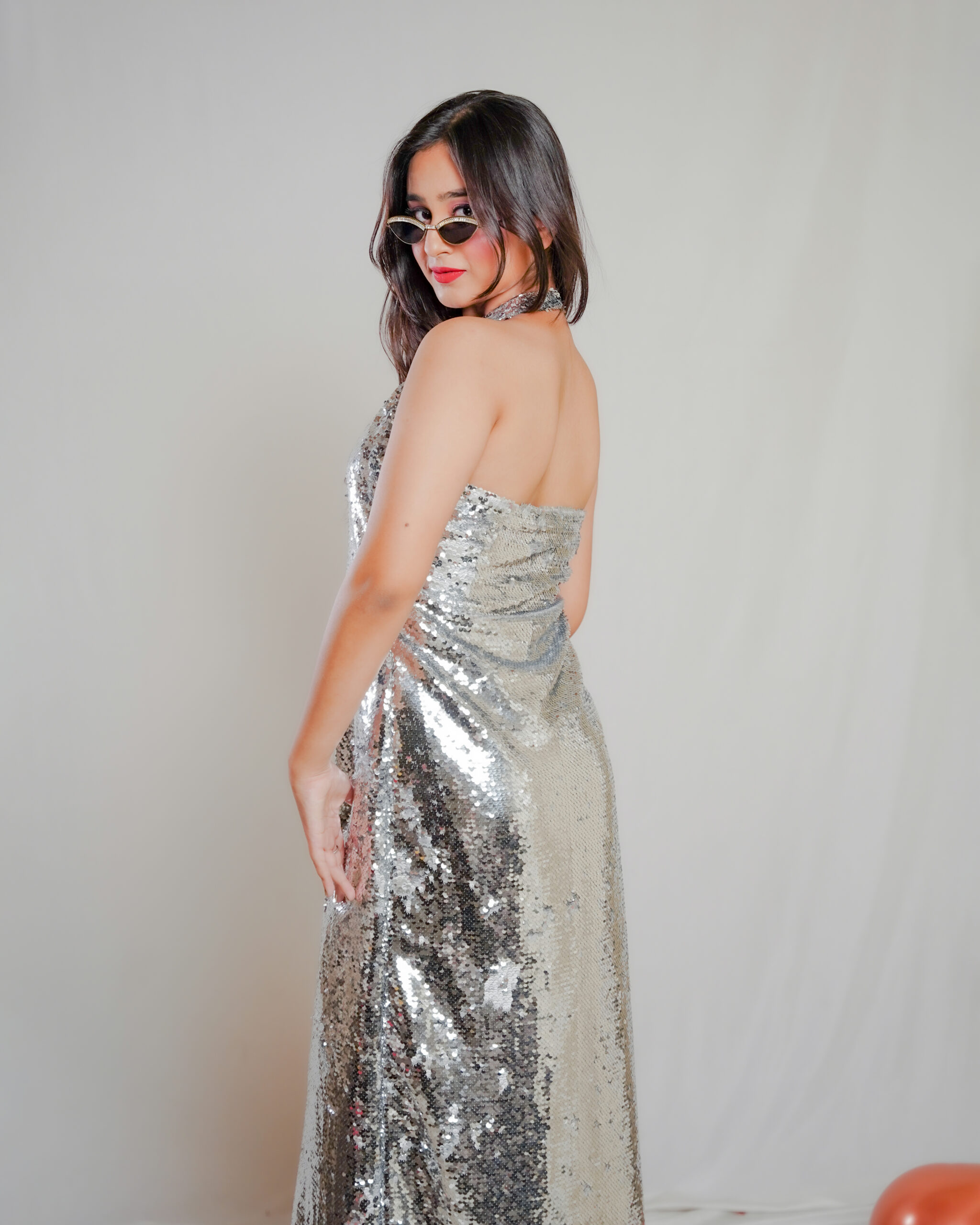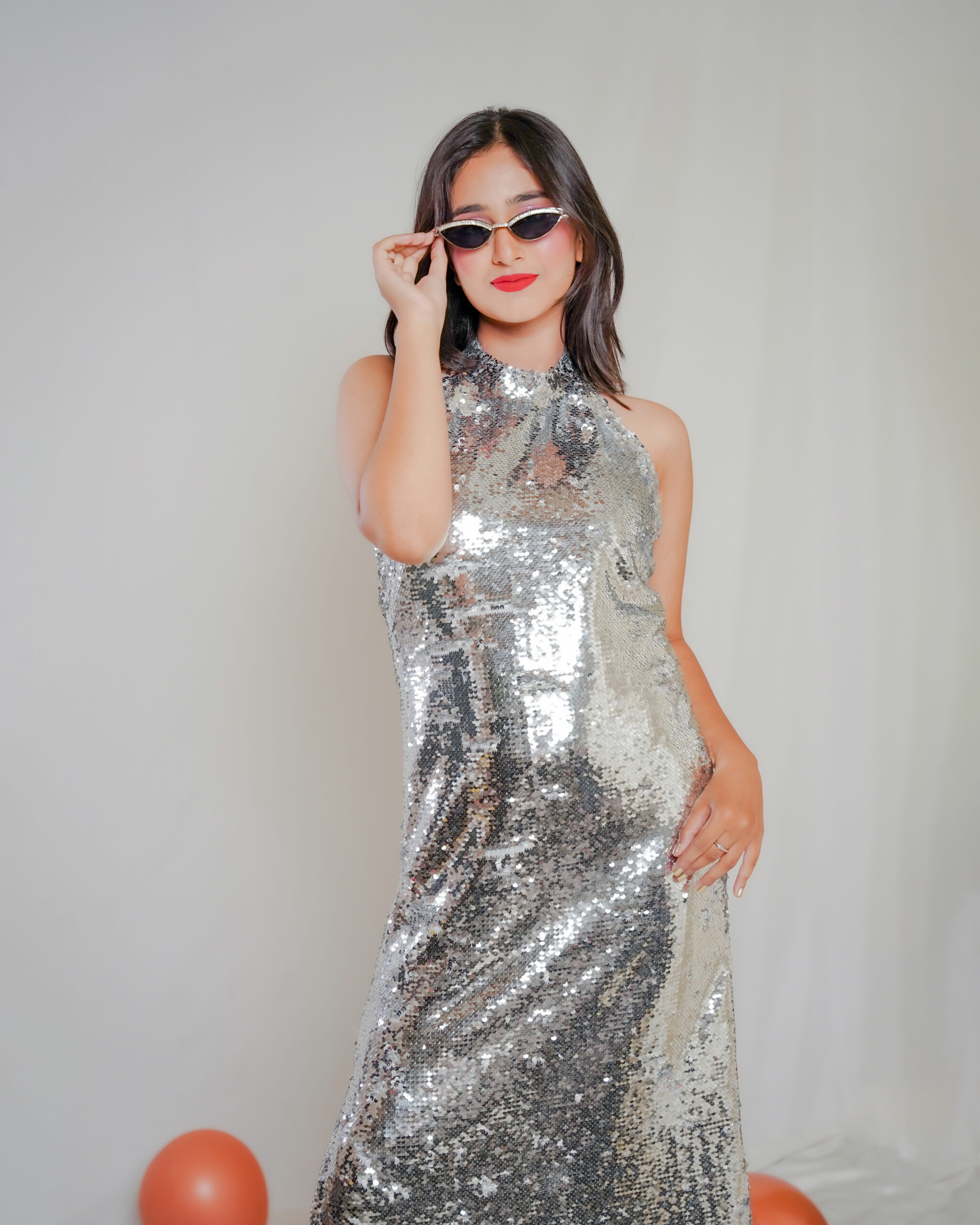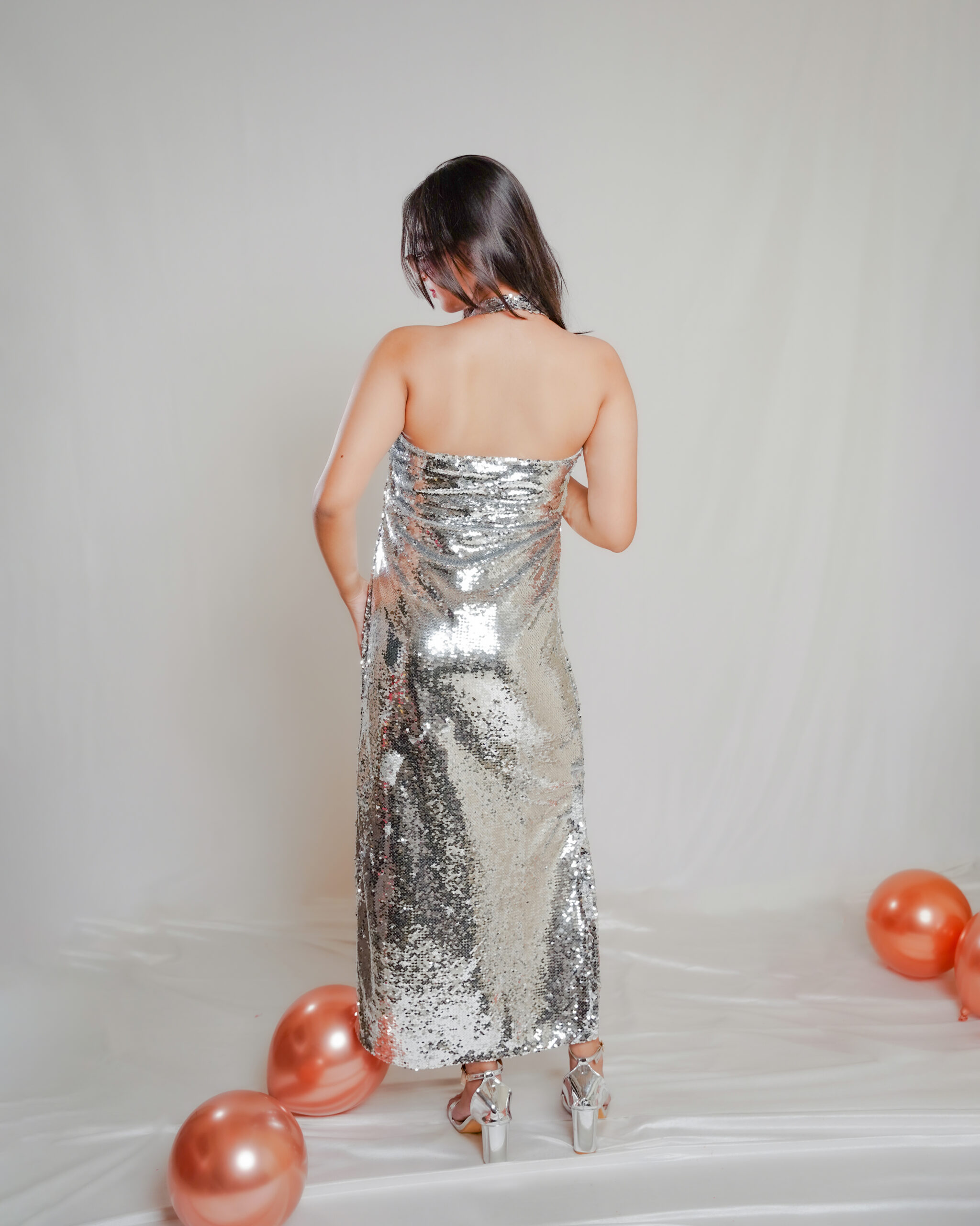 The Metallic Silver Sequin Dress dazzles with shimmering sequins, featuring a daring side slit and a stunning backless design—perfect for making a bold, glamorous statement at any evening event.