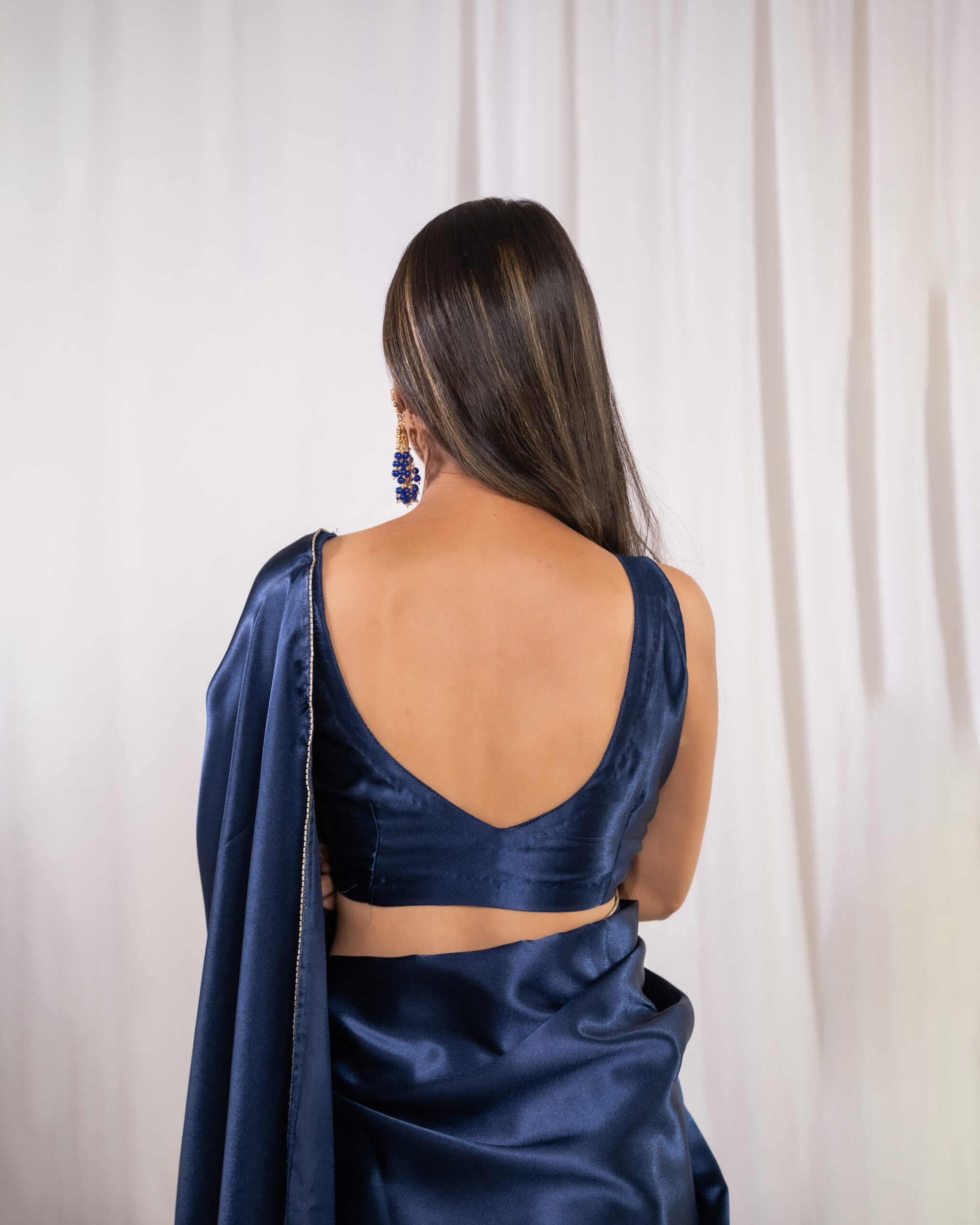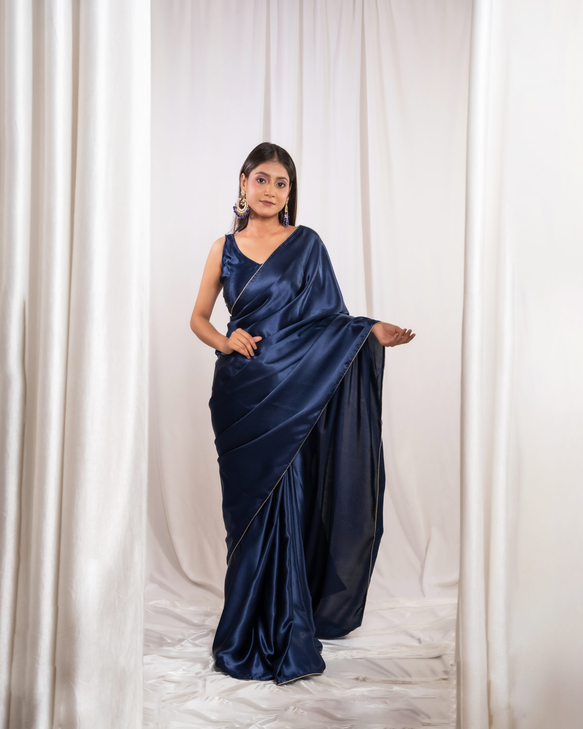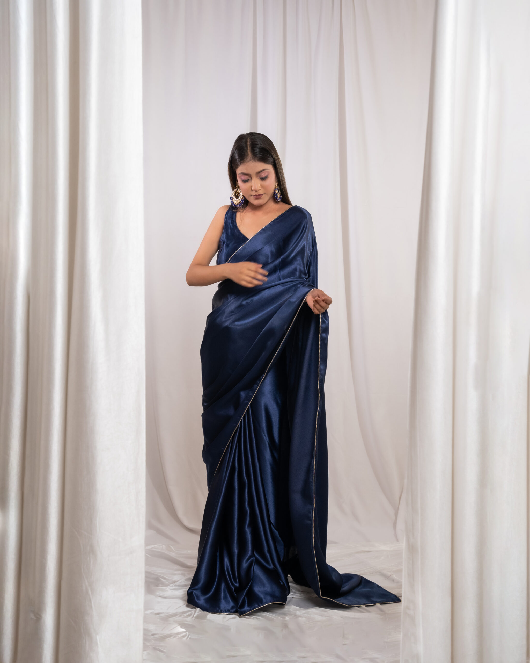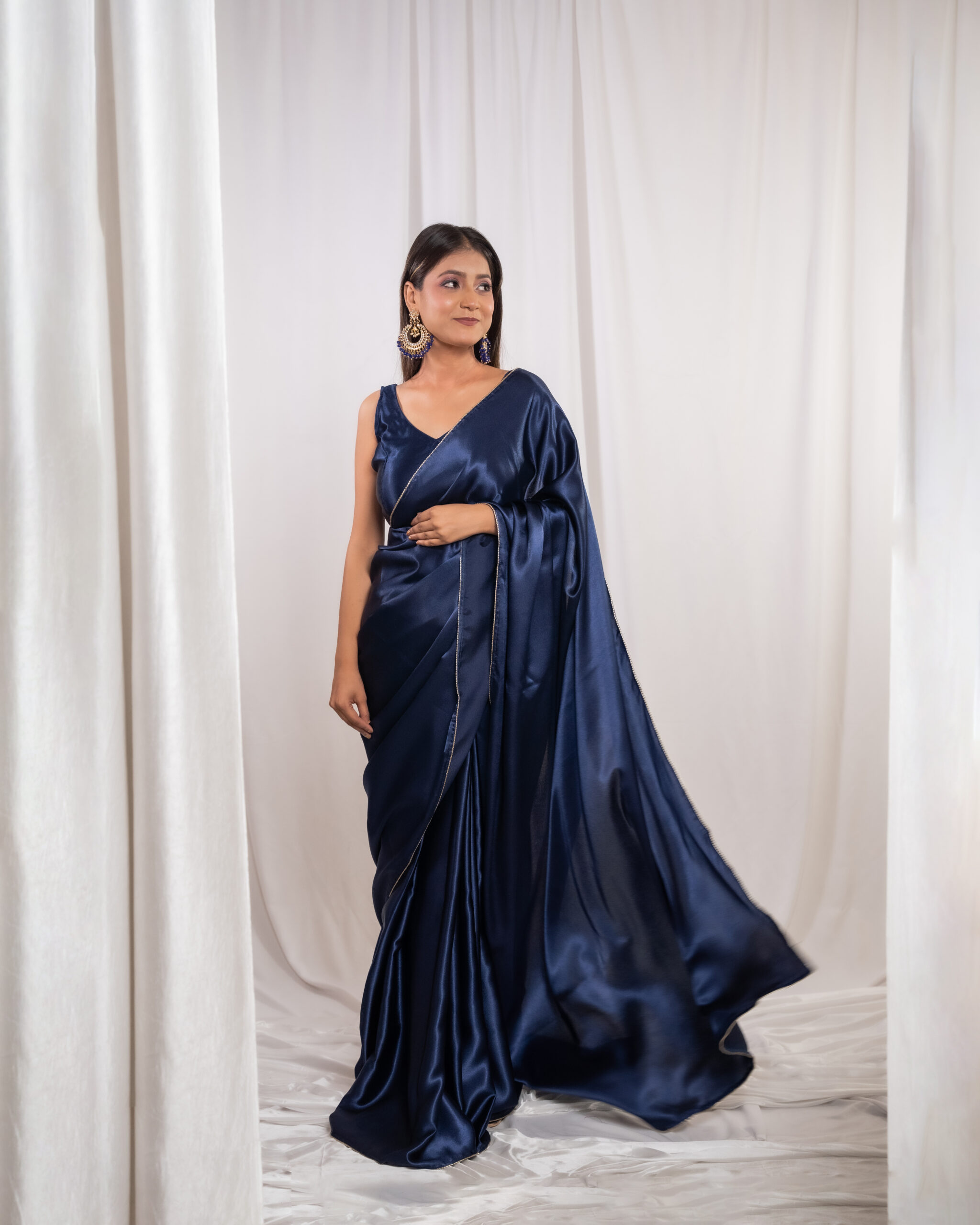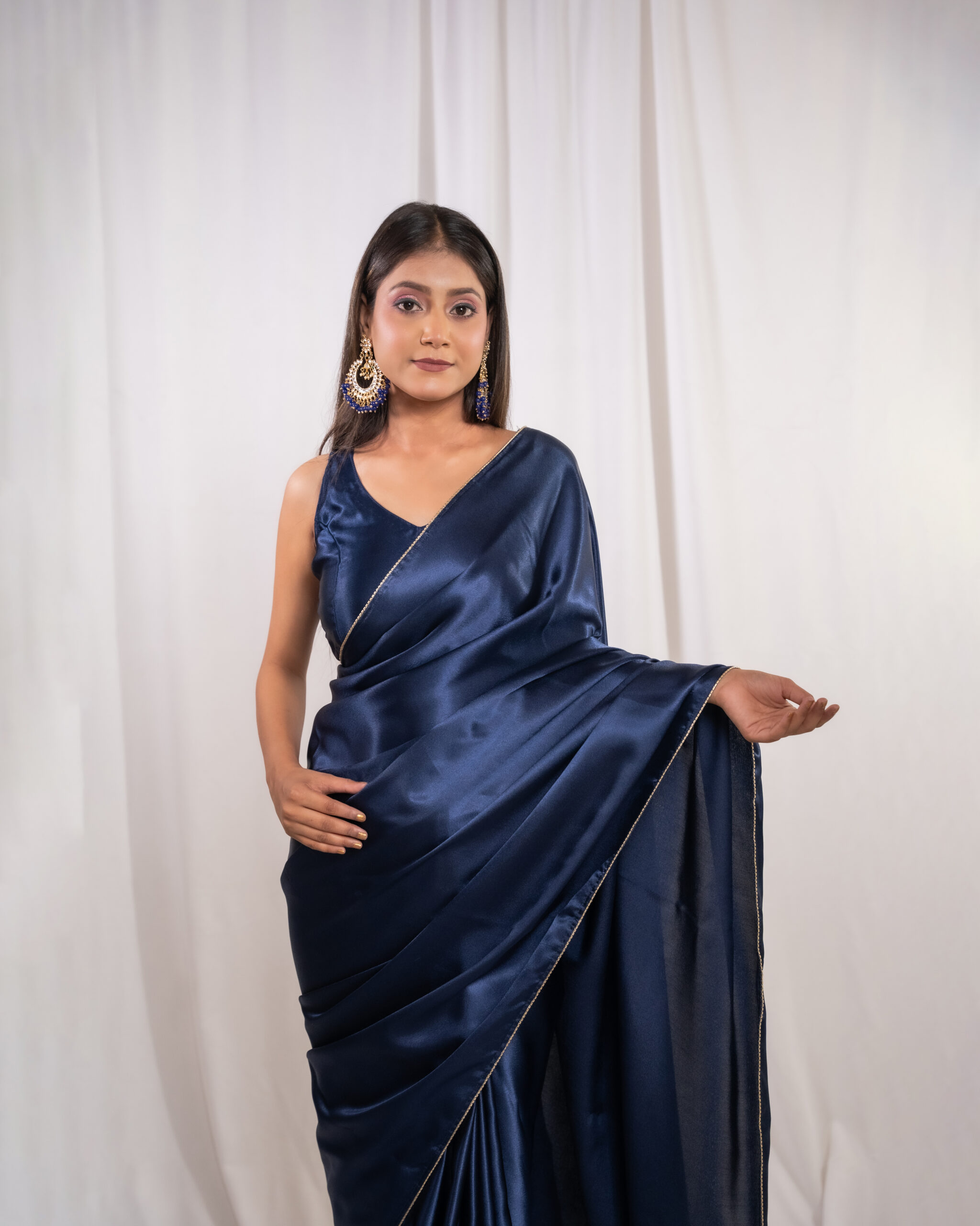 Drape yourself in sophistication with our Navy Blue Silk Satin Saree, highlighted by shimmering gold cut dana borders. The look is completed with a navy blue silk satin padded blouse, tailored in a style of your choice. Ideal for evening receptions and cocktail events, it exudes timeless grace with a modern edge.