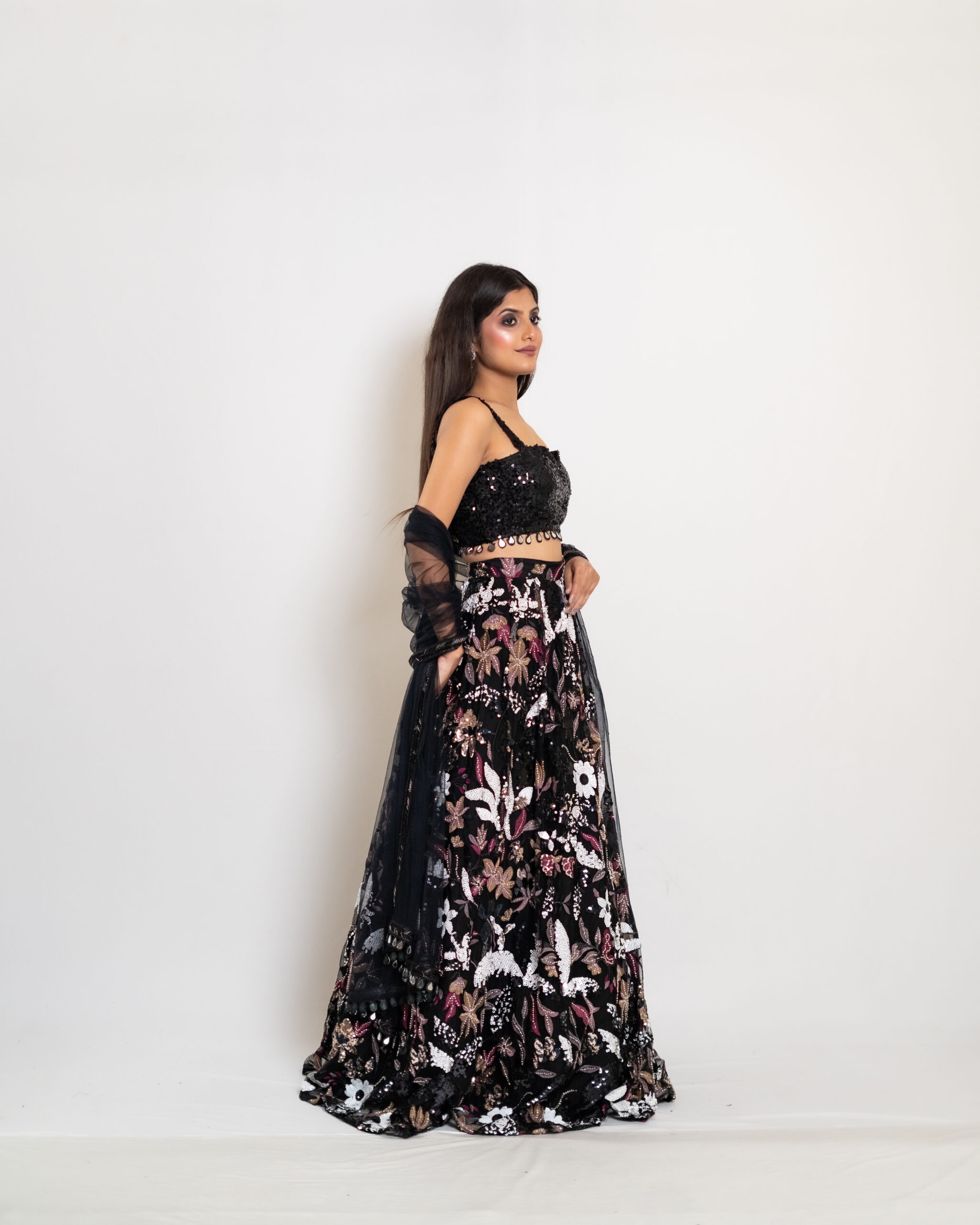 Noirflora is where midnight elegance meets floral charm. The lehenga showcases detailed cut dana, threadwork, and sequin embellishments that cascade gracefully along the skirt. A mirror-work blouse border adds shimmer, while the dupatta is framed with delicate mirror and cutdana edging. Paired with a matching potli, it’s a perfect for evening soirées, receptions, or sangeet nights where elegance meets allure.