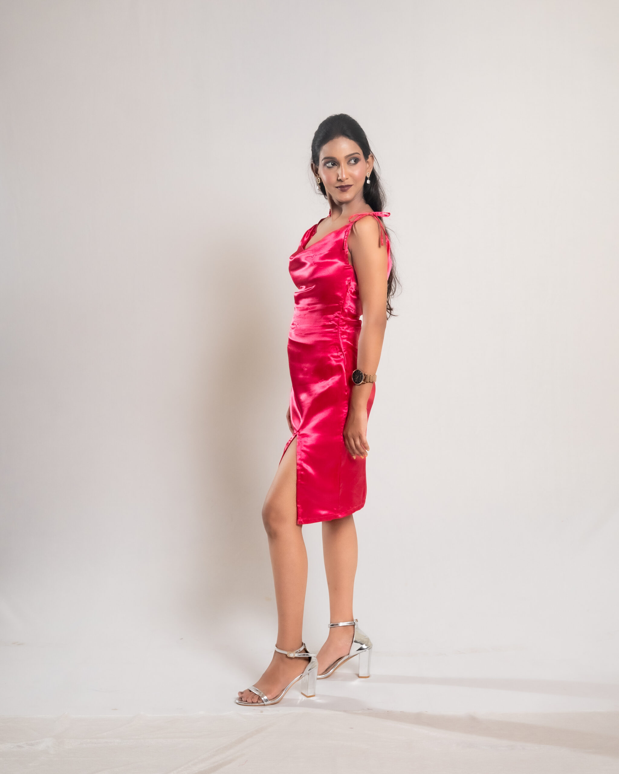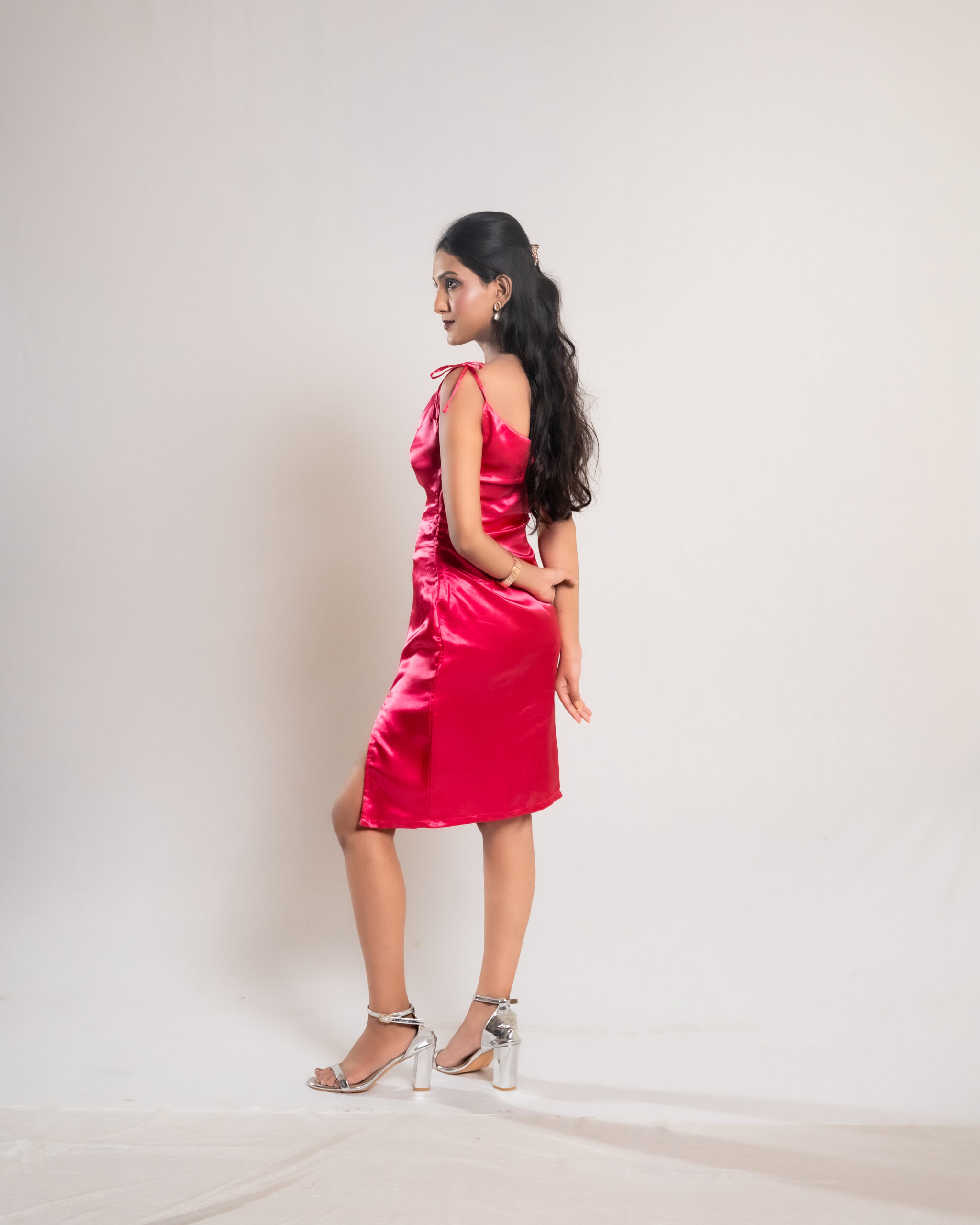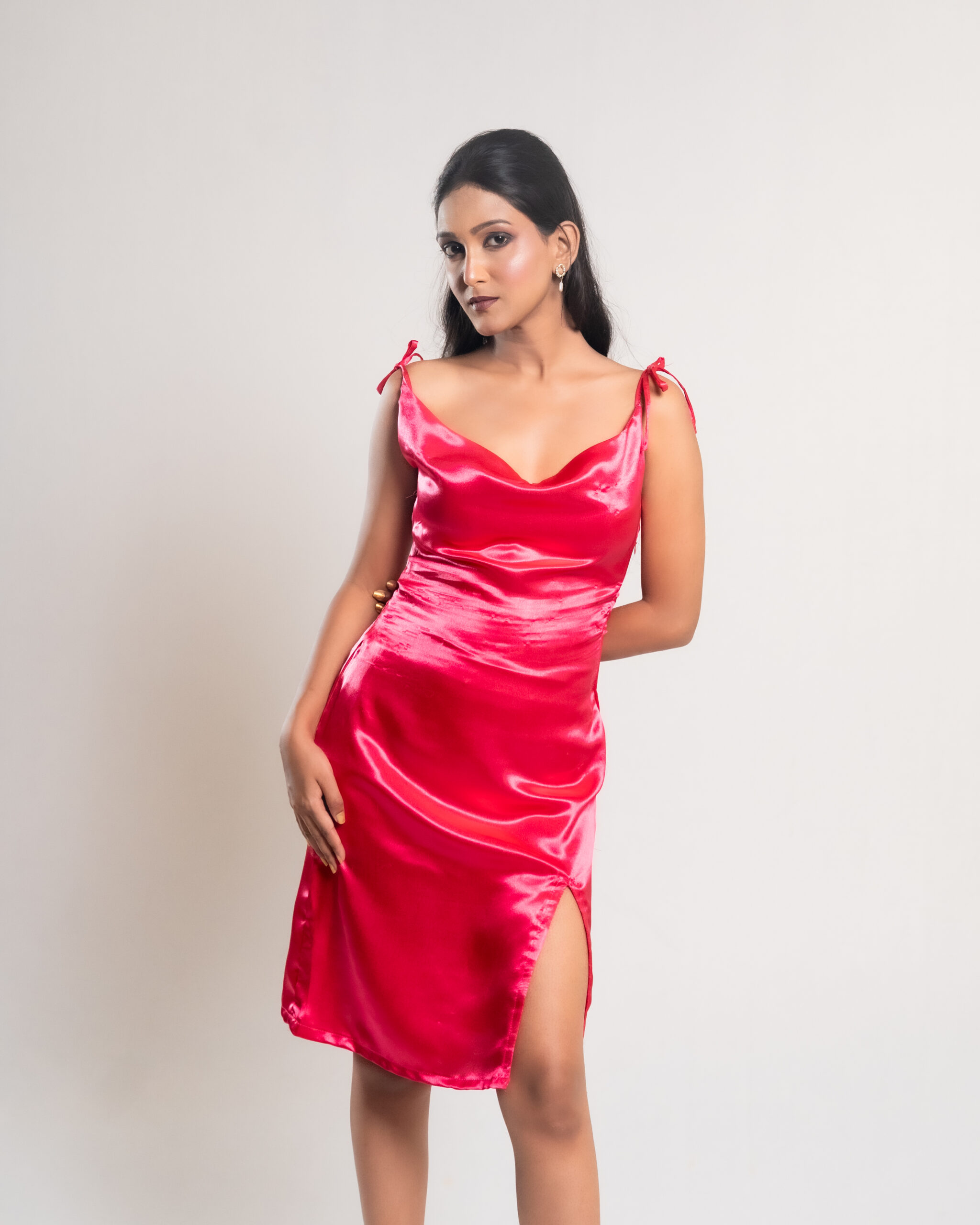 The Pink Satin Ribbon Tie and Slit Dress features smooth satin fabric, a flattering ribbon shoulder tie, and a bold slit, creating an elegant and stylish look perfect for special occasions and evening events.