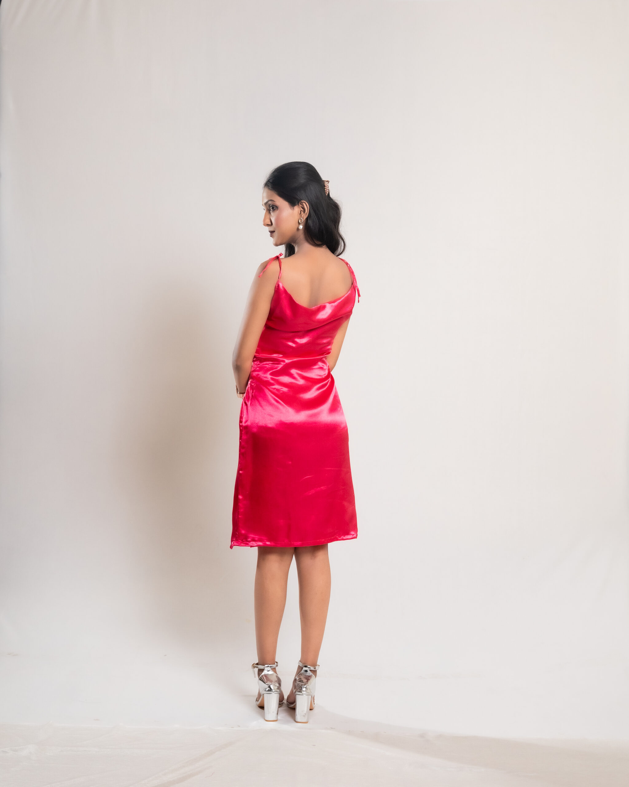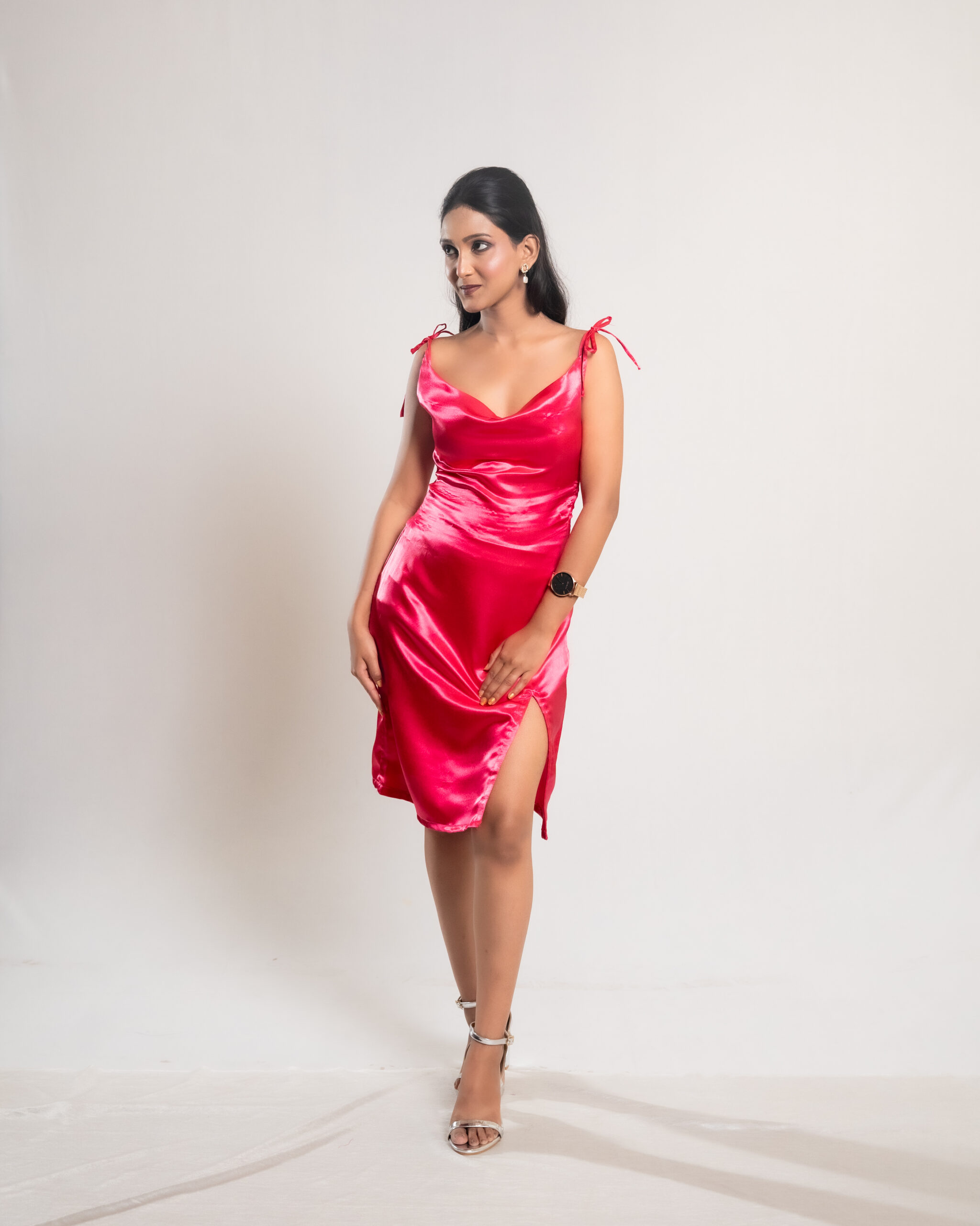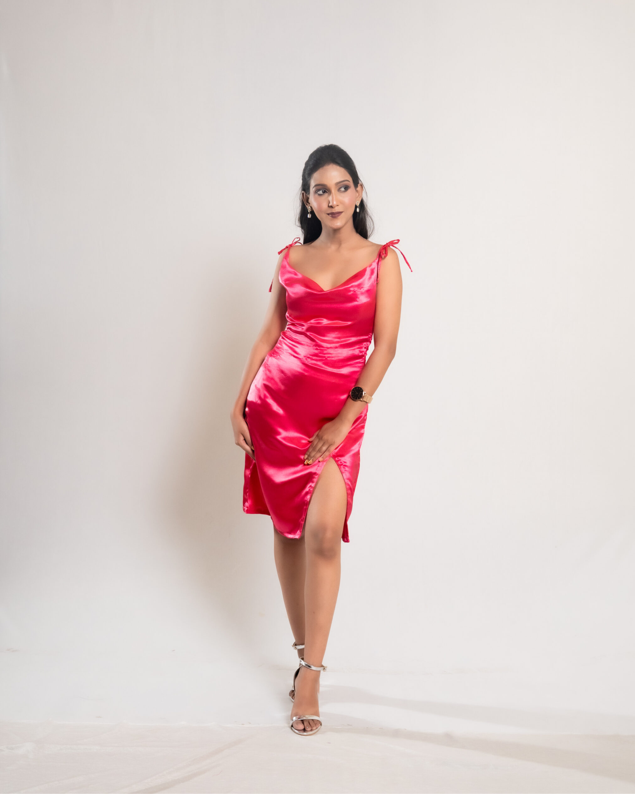 The Pink Satin Ribbon Tie and Slit Dress features smooth satin fabric, a flattering ribbon shoulder tie, and a bold slit, creating an elegant and stylish look perfect for special occasions and evening events.