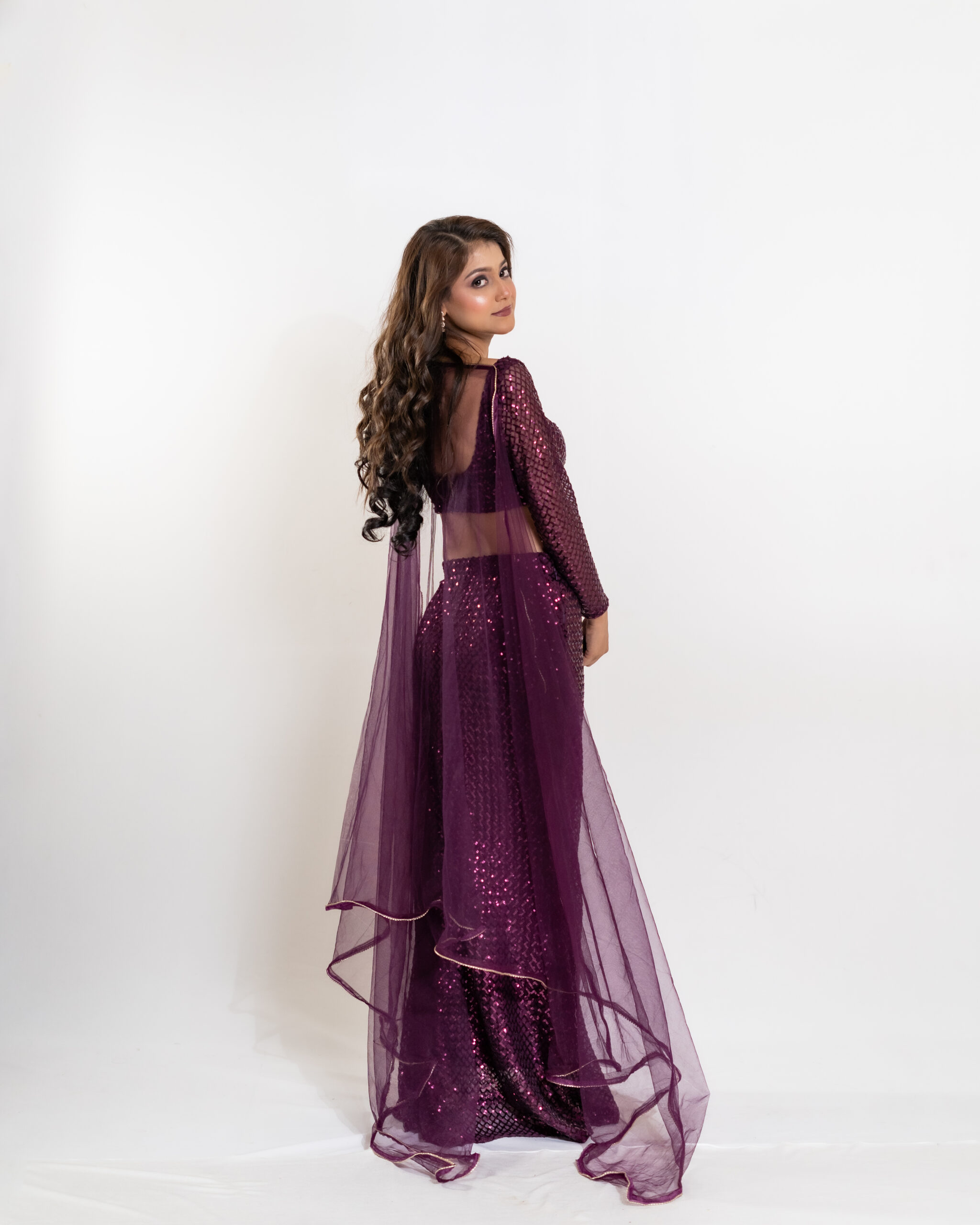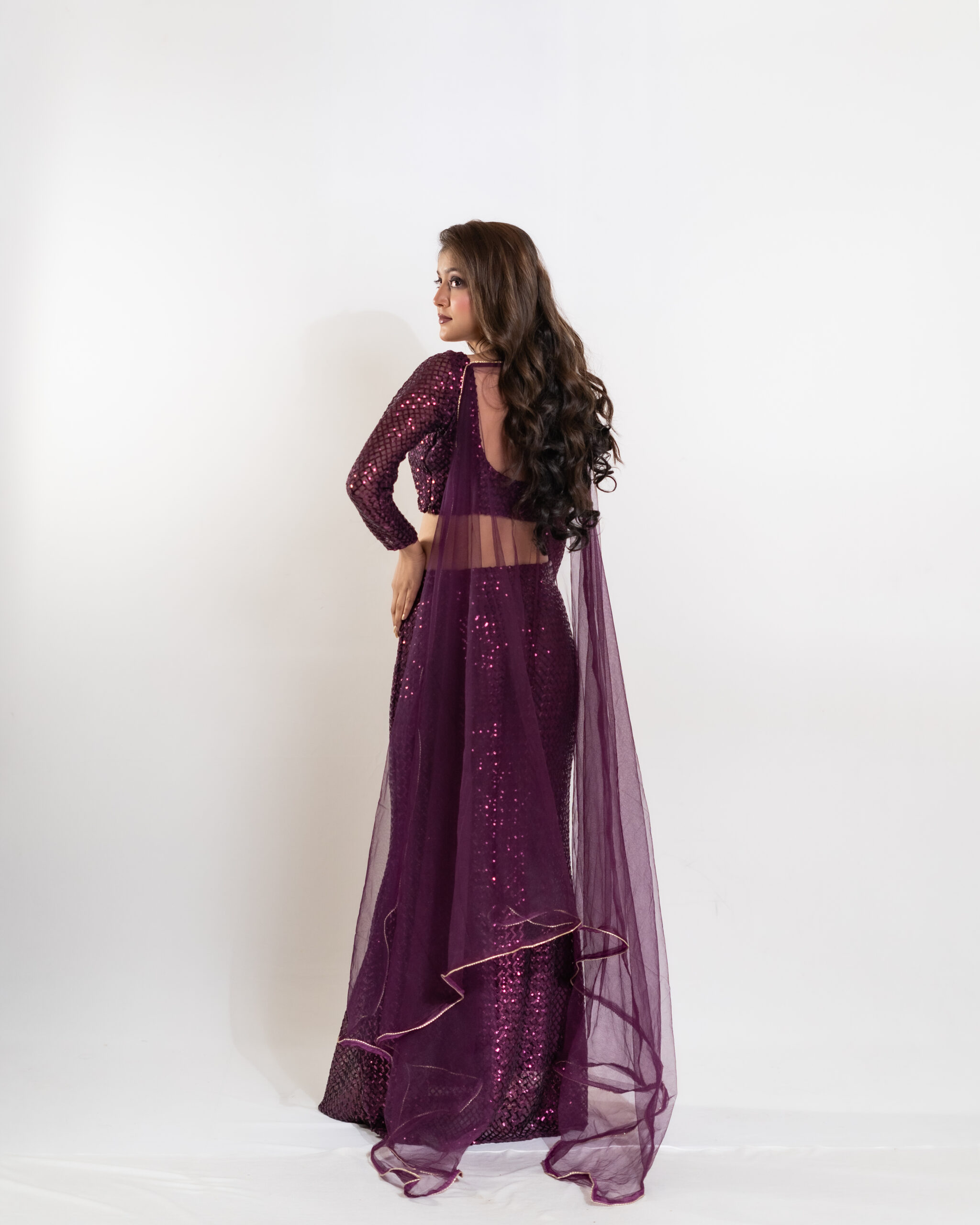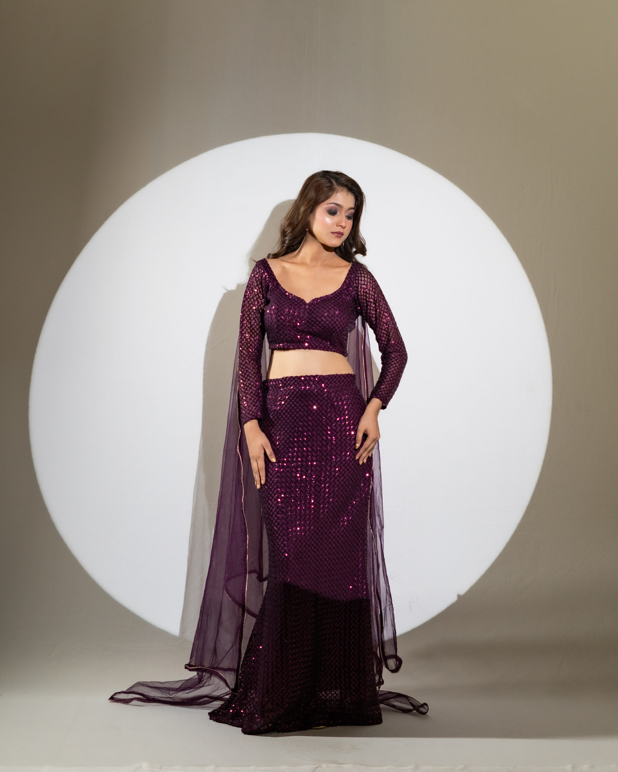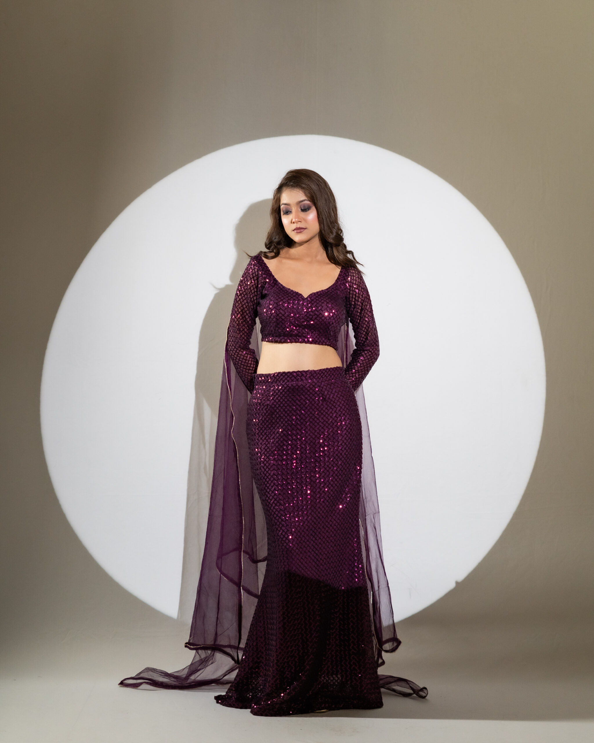 Plumora embodies the richness of plum with an aura of refined glamour. This deep wine sequin lehenga set features a fitted silhouette, full-sleeved blouse, and a dramatic net dupatta with light gold cut-dana border. Paired with a complimentary matching potli, Plumora is designed for cocktail nights and receptions, radiating bold sophistication, elegance, and unforgettable sparkle in every movement.