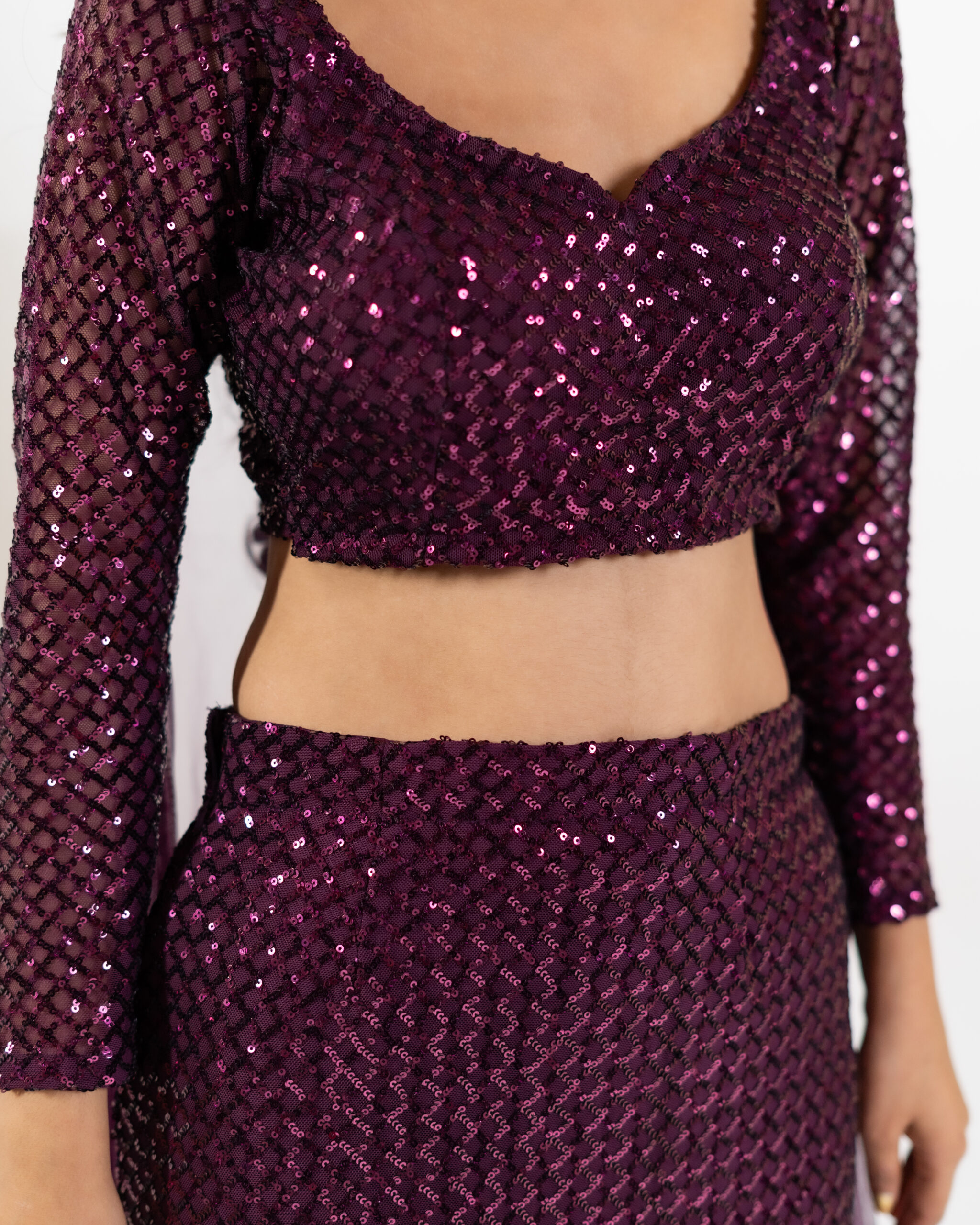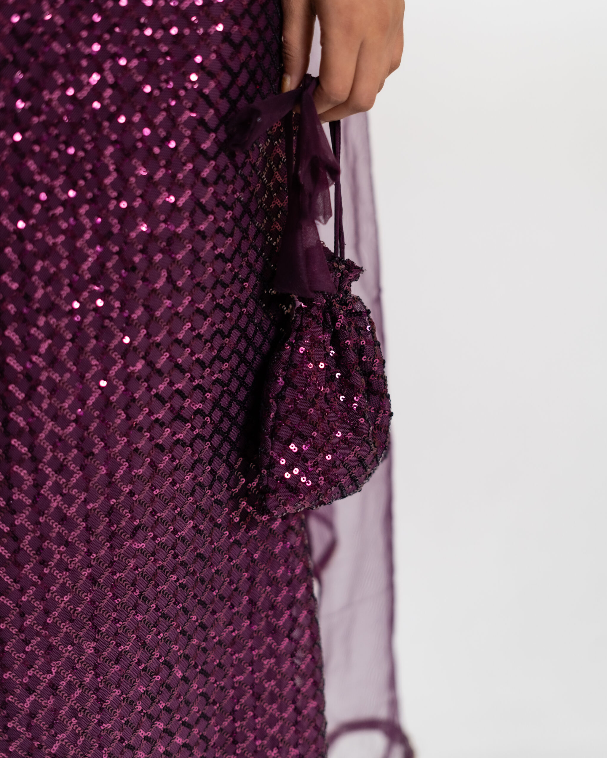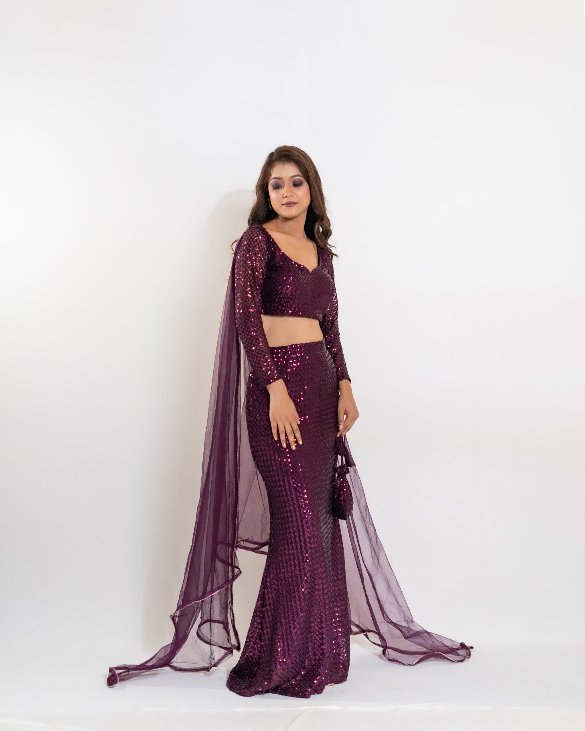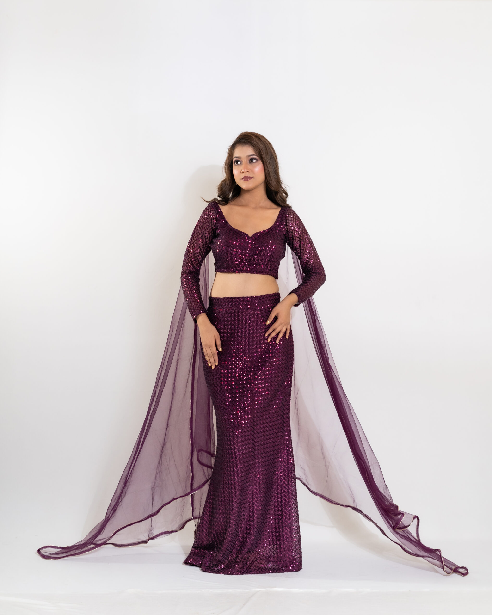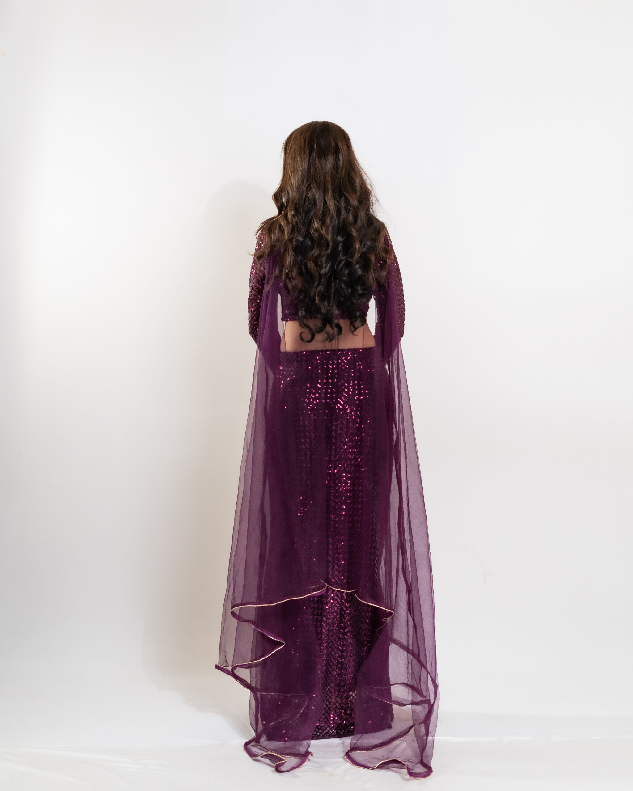 Plumora embodies the richness of plum with an aura of refined glamour. This deep wine sequin lehenga set features a fitted silhouette, full-sleeved blouse, and a dramatic net dupatta with light gold cut-dana border. Paired with a complimentary matching potli, Plumora is designed for cocktail nights and receptions, radiating bold sophistication, elegance, and unforgettable sparkle in every movement.