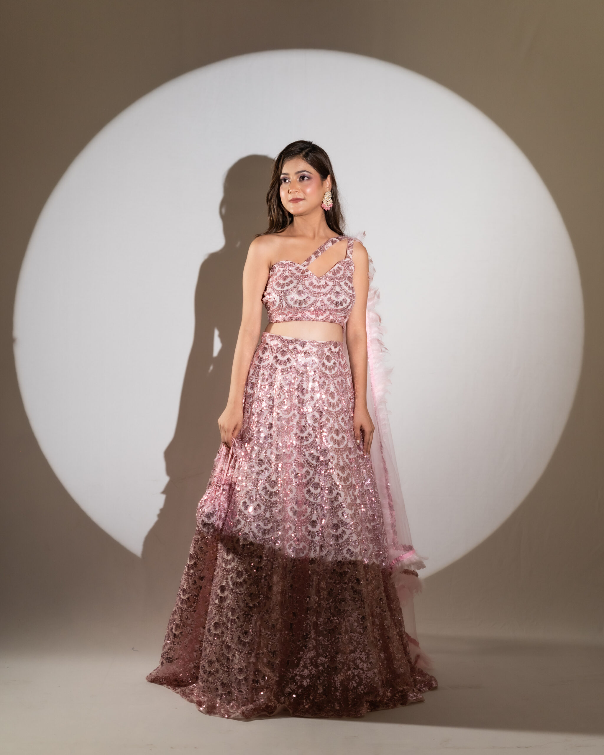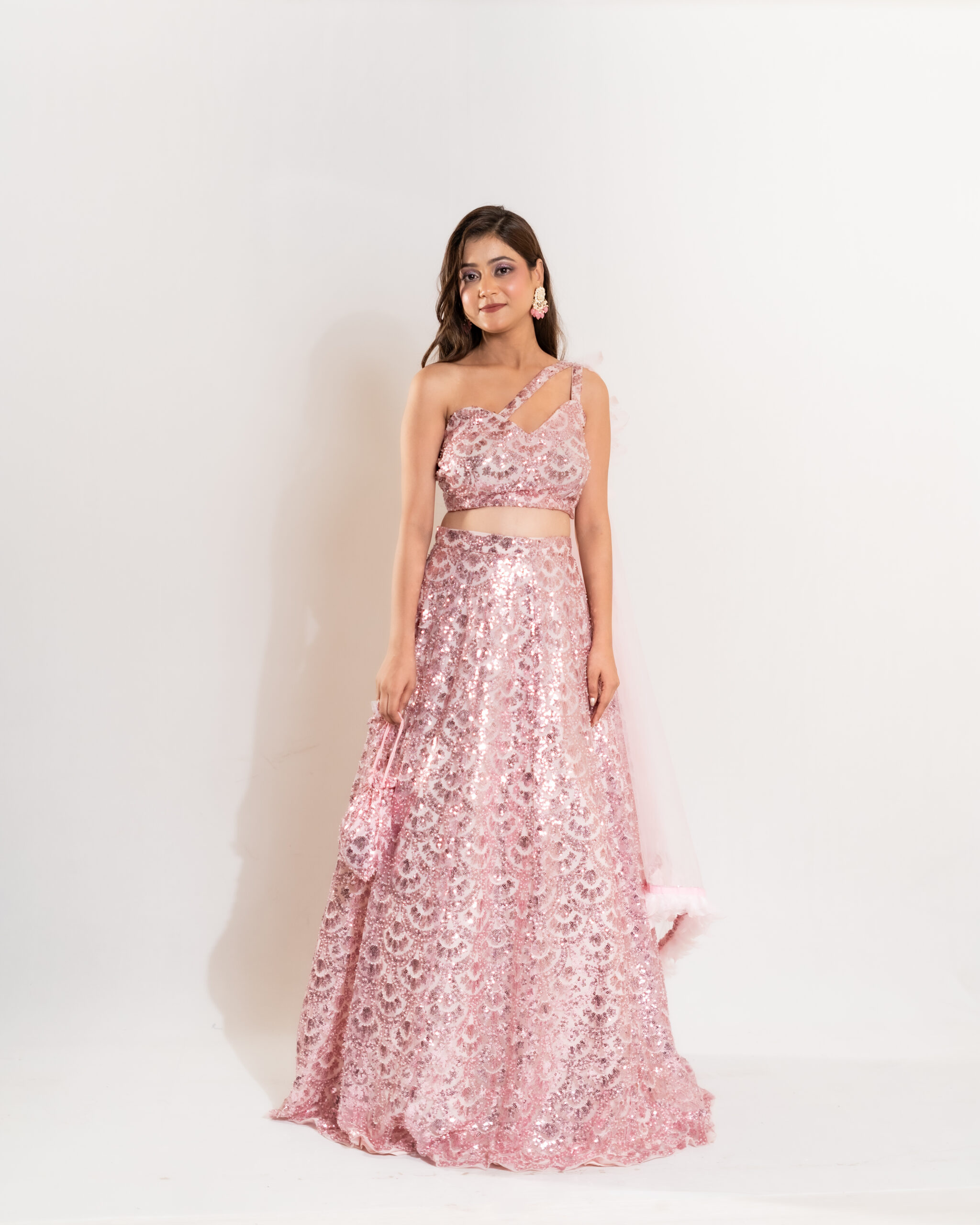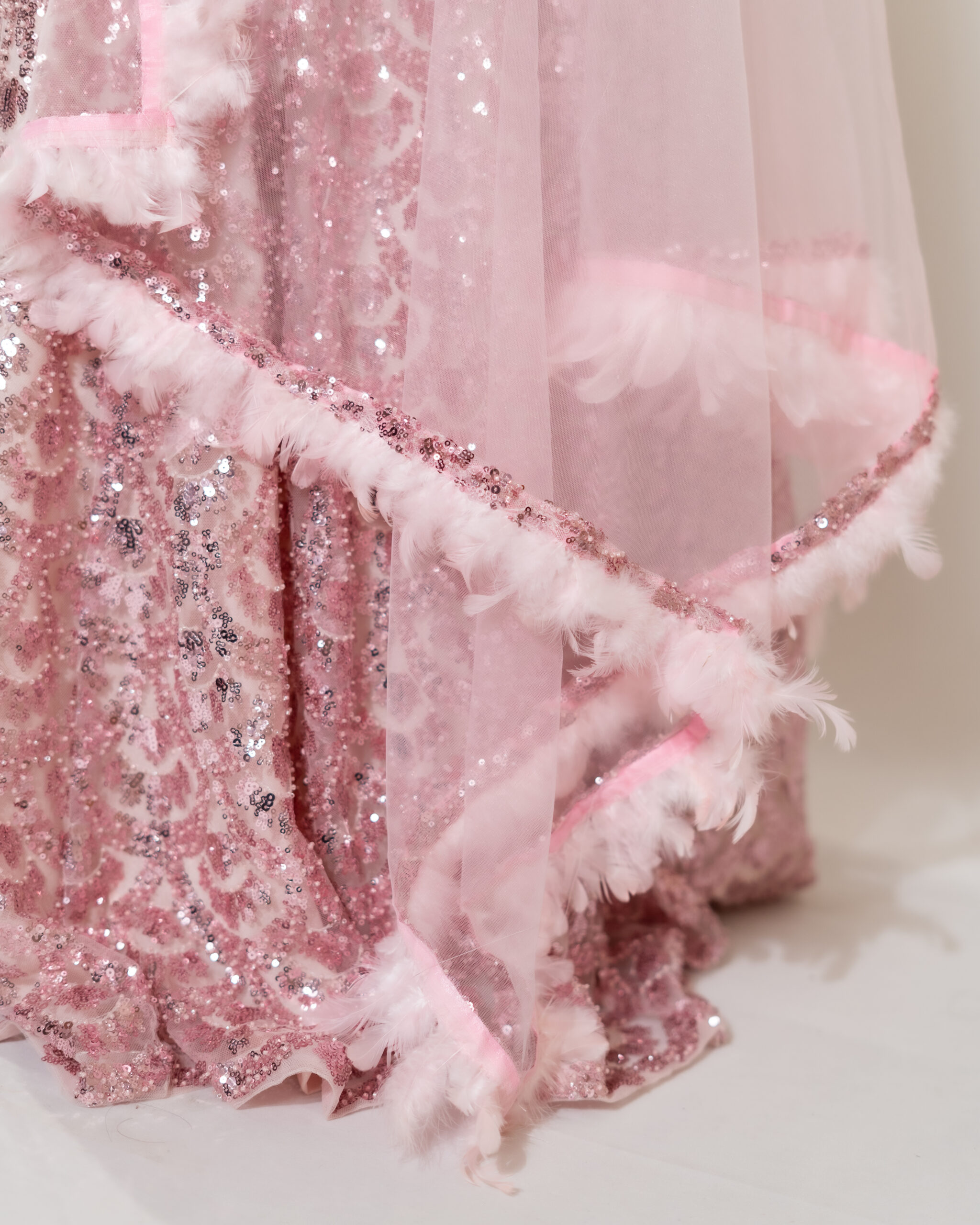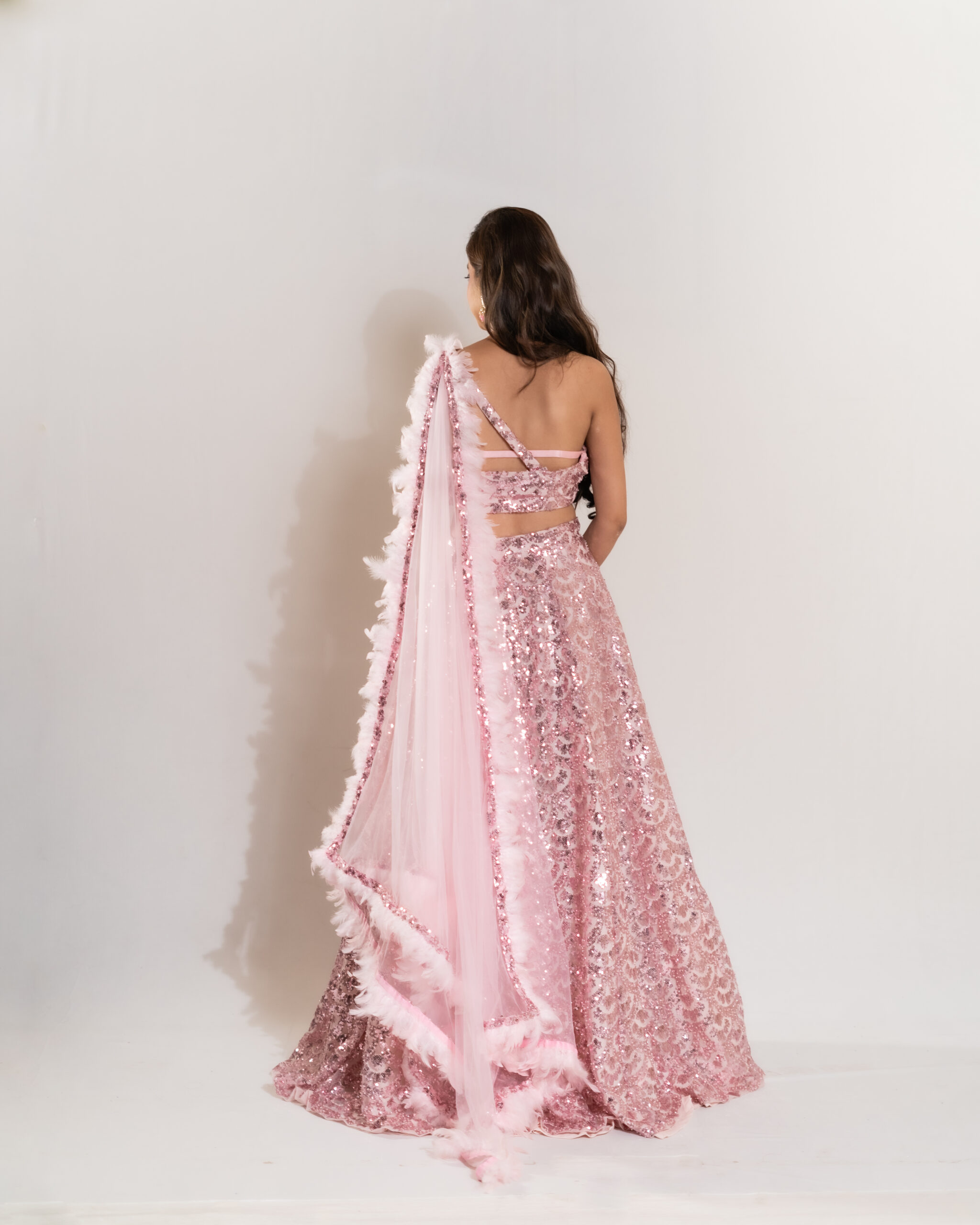 Rosalia embodies rose-like elegance with a timeless appeal. This pastel pink sequin lehenga stuns with a soft feather-bordered dupatta, adding a whisper of glamour. The standout feature—a designer cross-strap back—offers a modern twist to its classic charm. Paired with a complimentary matching potli – perfect for bridesmaids or festive soirées, Rosalia radiates femininity, grace, and couture sophistication with every shimmering step.