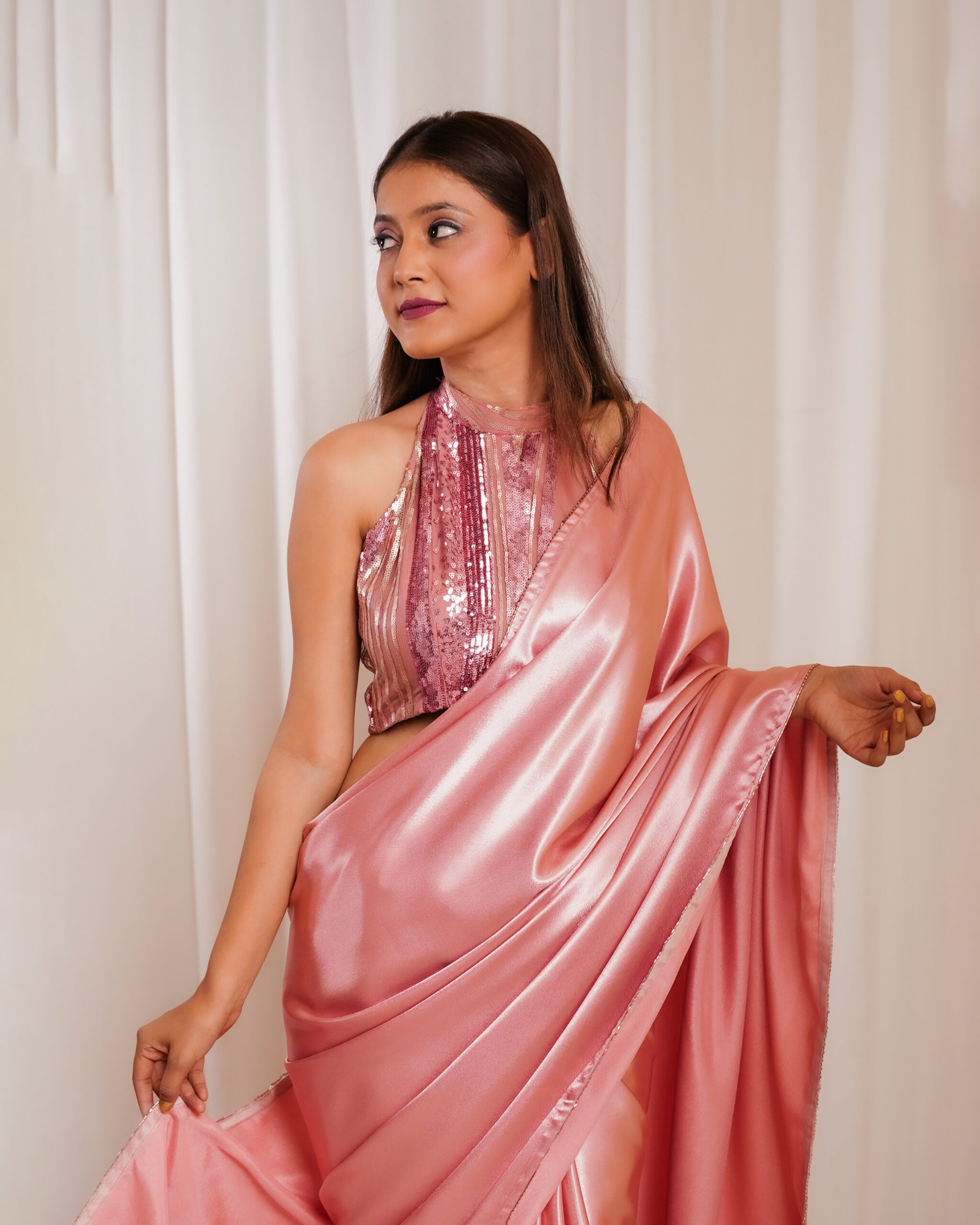 Soft glam takes center stage in this Rose Gold Silk Satin Saree featuring intricate rose gold cut dana borders. It’s paired with a rose gold padded sequin blouse. A modern pick for sangeets, engagements, or pastel-themed celebrations.