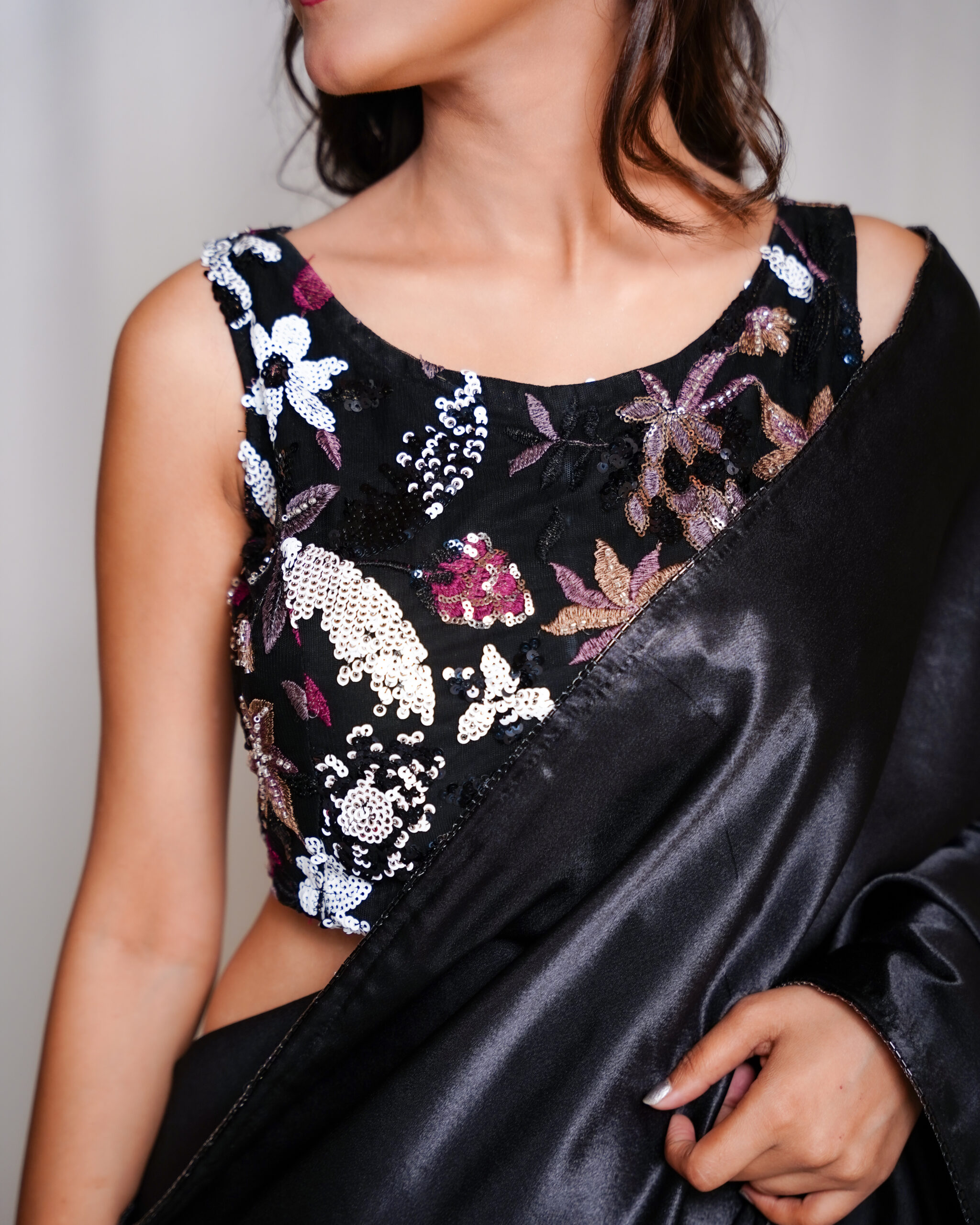 Fabric: Silk Satin (saree) / Sequin Net (blouse)
