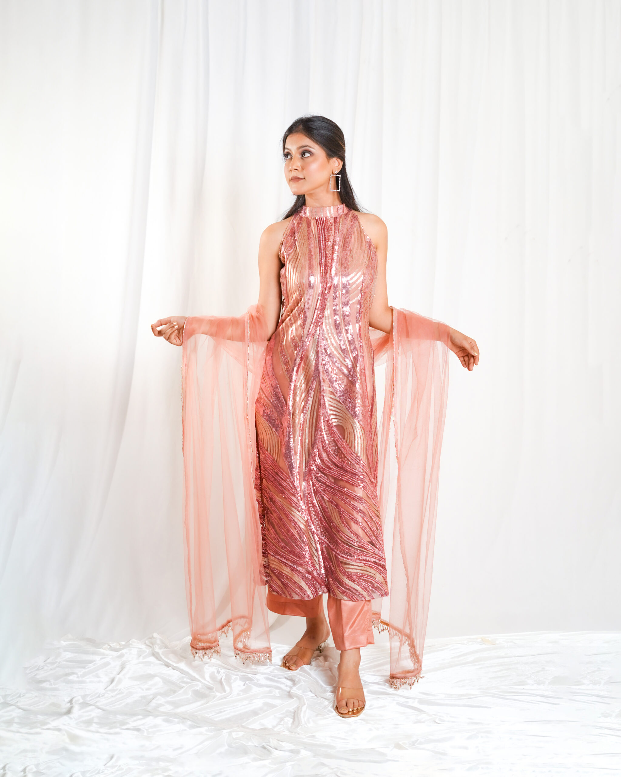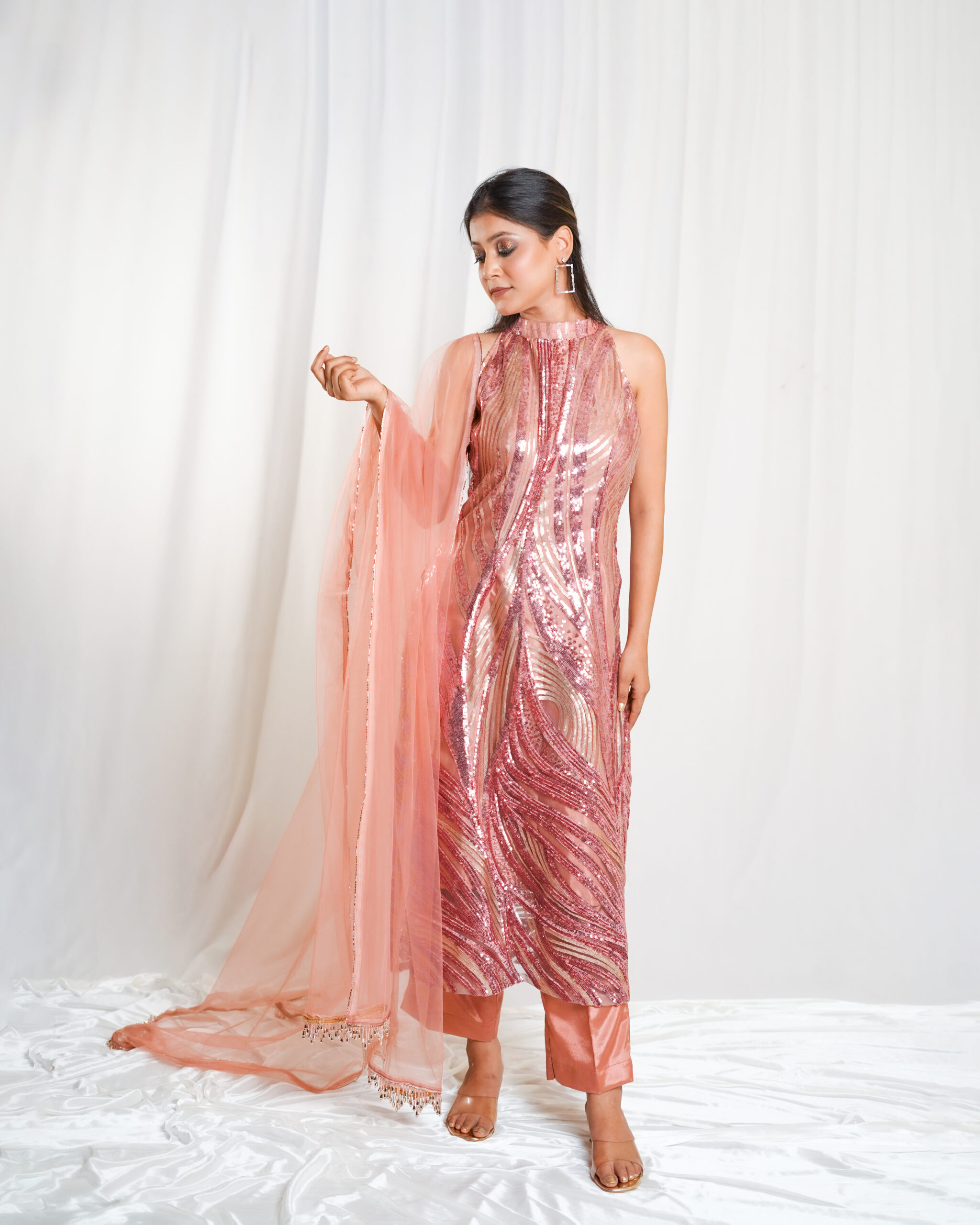 A graceful rose gold Indo-Western set featuring a golden sequin-embroidered top paired with rose gold shantoon bottoms. The look is completed with a rose gold net dupatta adorned with gold beads, rose gold pearl border, and a shimmering gold cutdana border—an ethereal choice for weddings, festive celebrations, or elegant soirées.