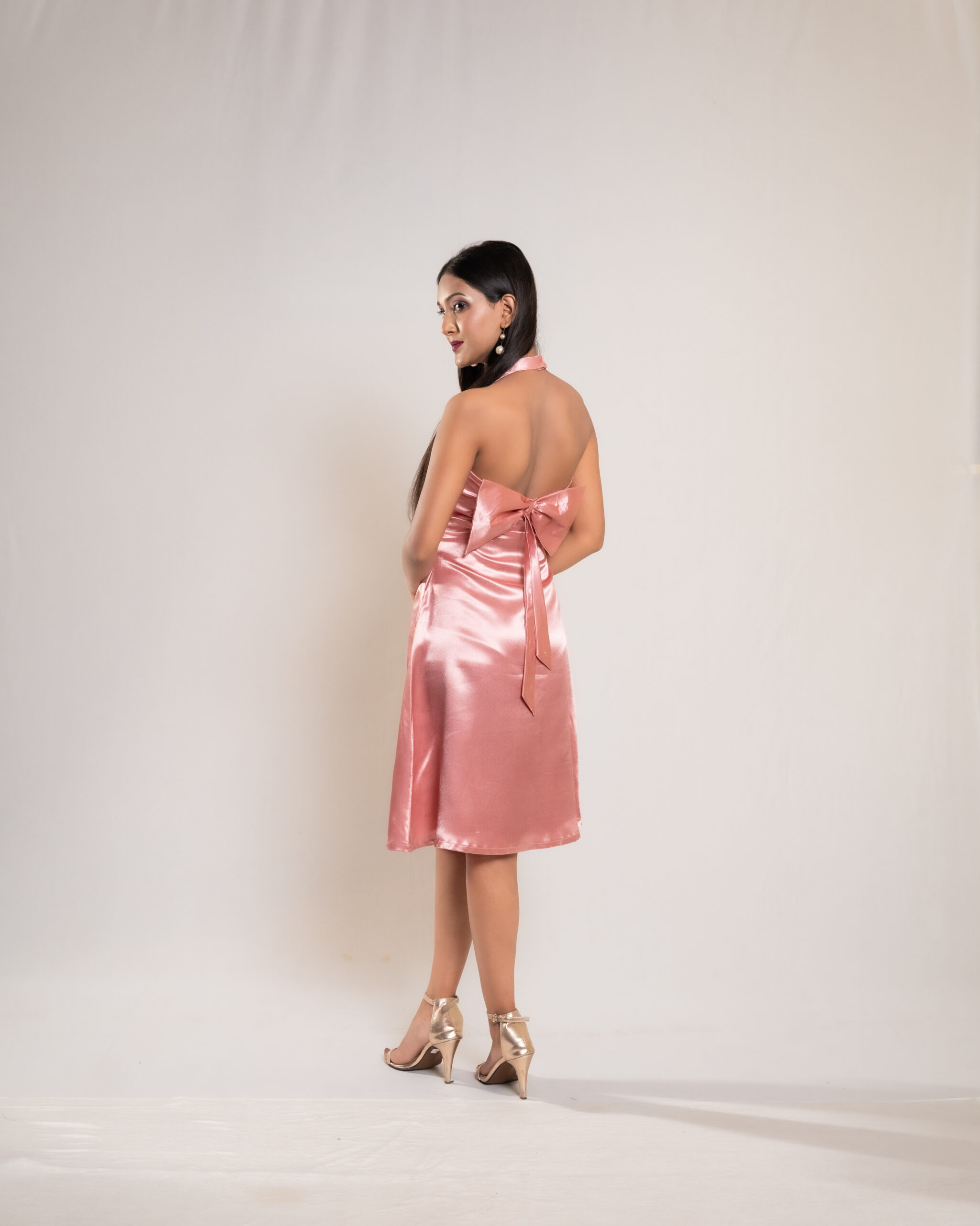 The Rose Gold Satin Backless Bow Dress dazzles with its soft metallic sheen, featuring an elegant backless design and a charming bow—perfect for glamorous evenings and special occasions.