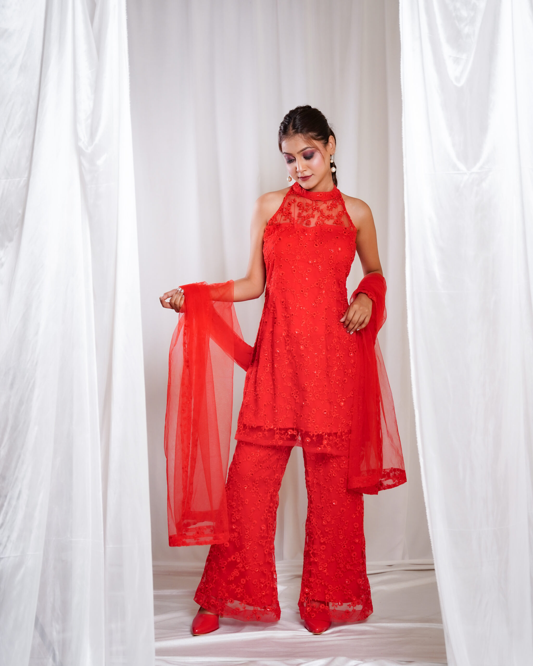 A bold red Indo-Western set featuring an illusion neckline and all-over red threadwork and sequin embroidery on both the top and bottom. Paired with a matching red net dupatta adorned with intricately embroidered red thread and sequin borders, this striking ensemble is perfect for weddings, festive occasions, and evening glamour.