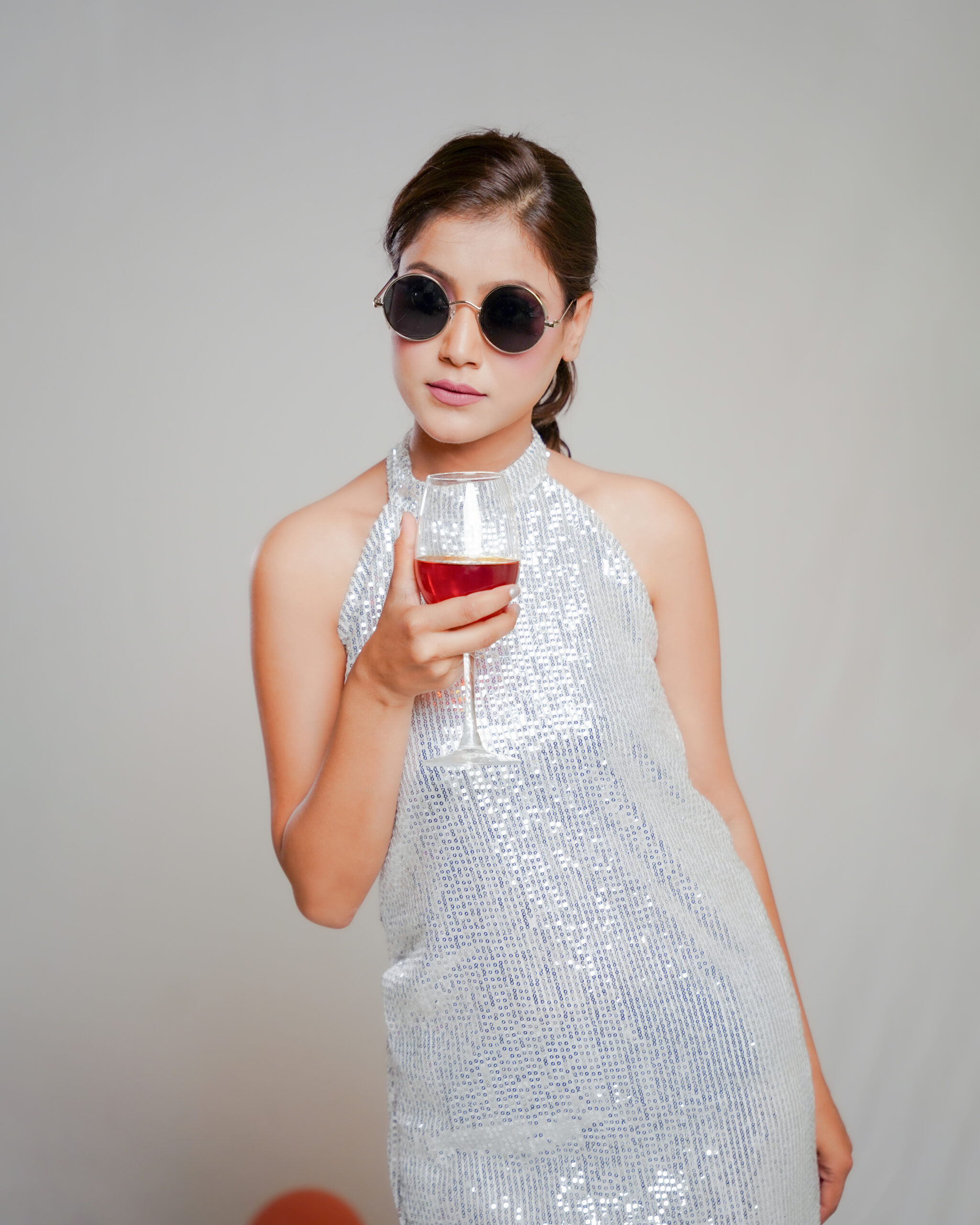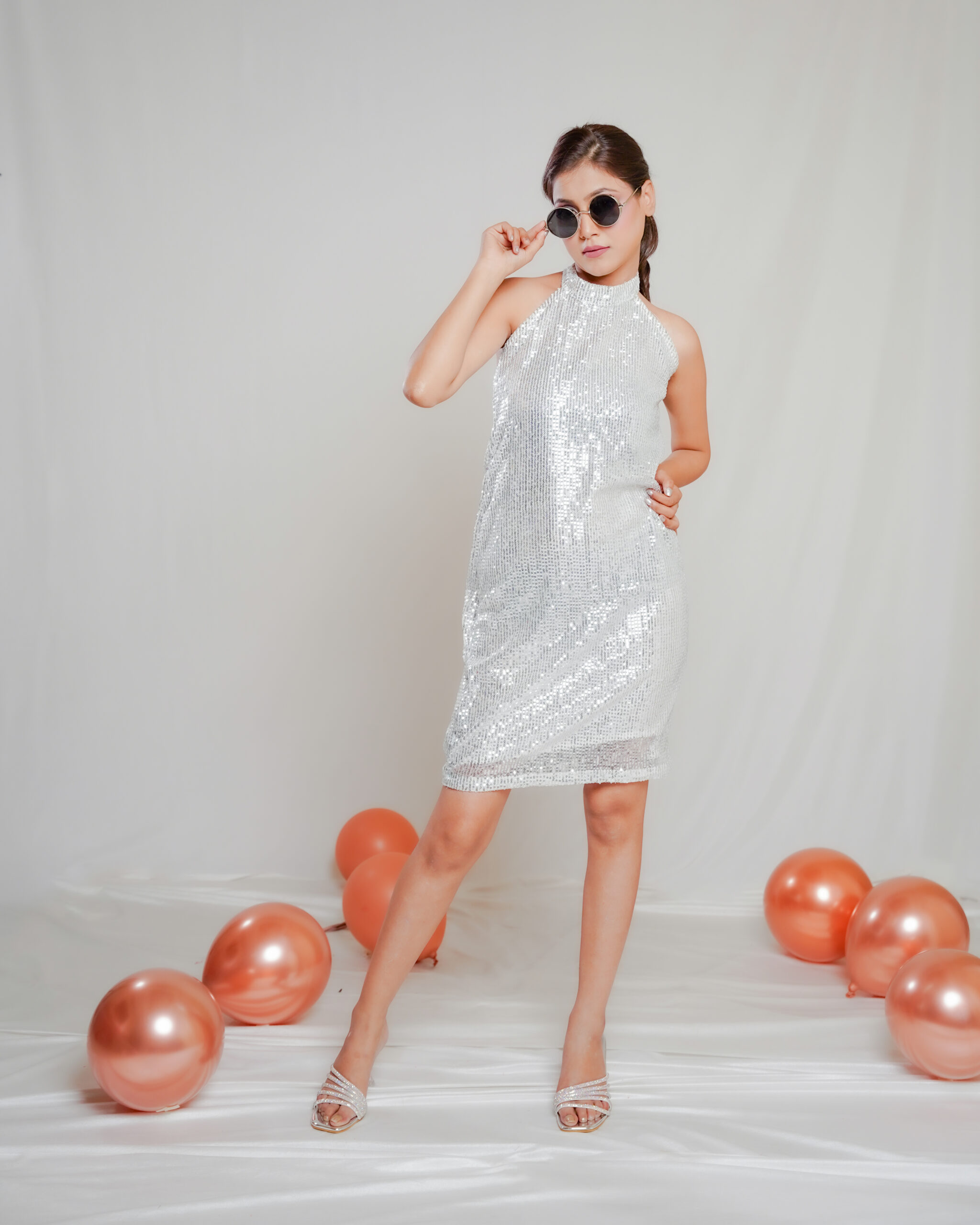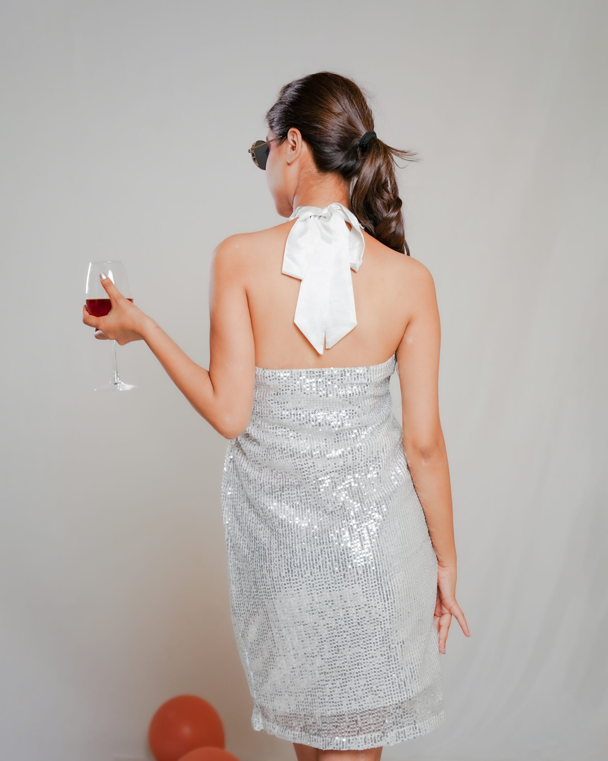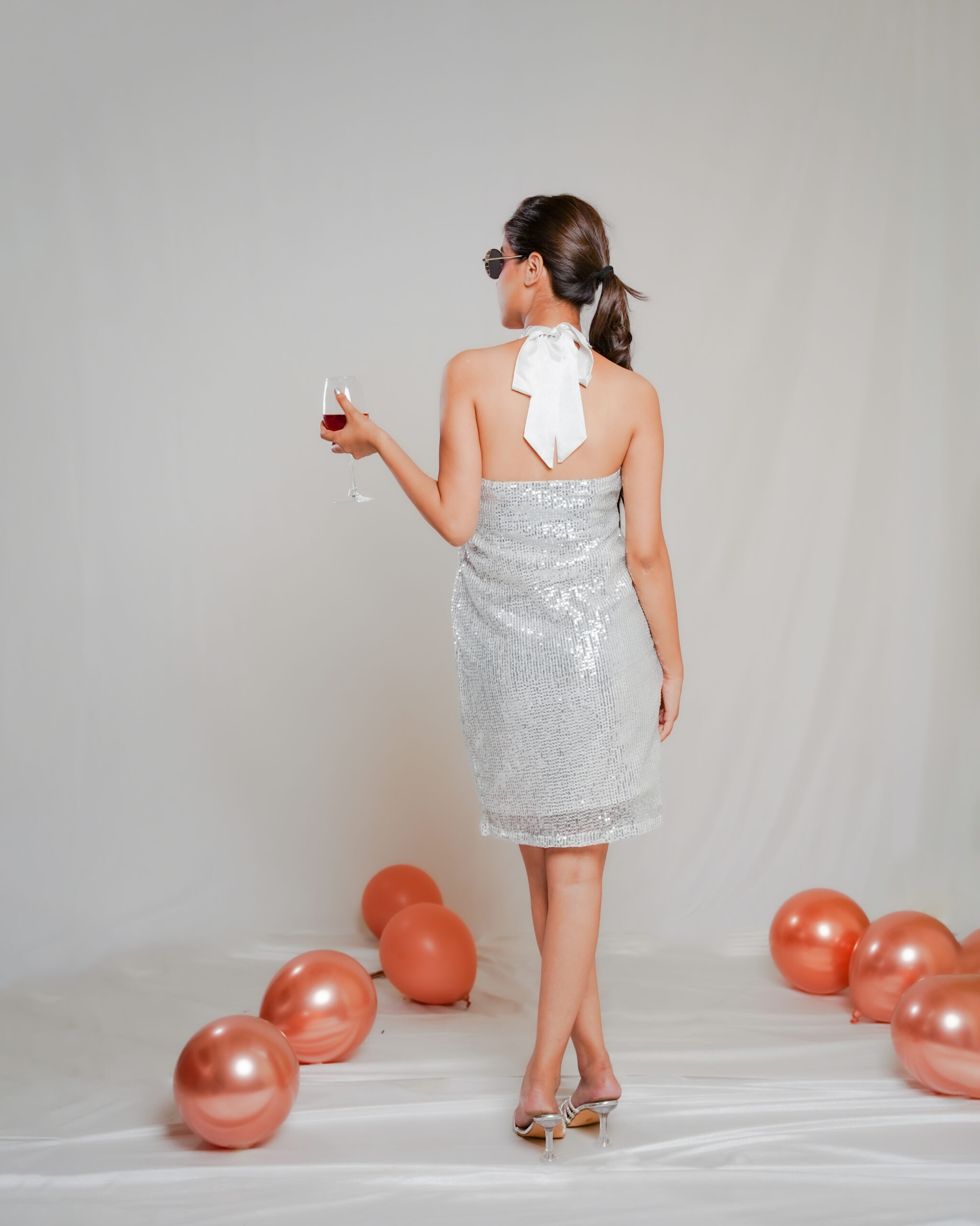 The Silver Sequin Bow Dress with Bow Closure sparkles with dazzling silver sequins, featuring a charming bow detail for a playful yet elegant look perfect for parties and special occasions.