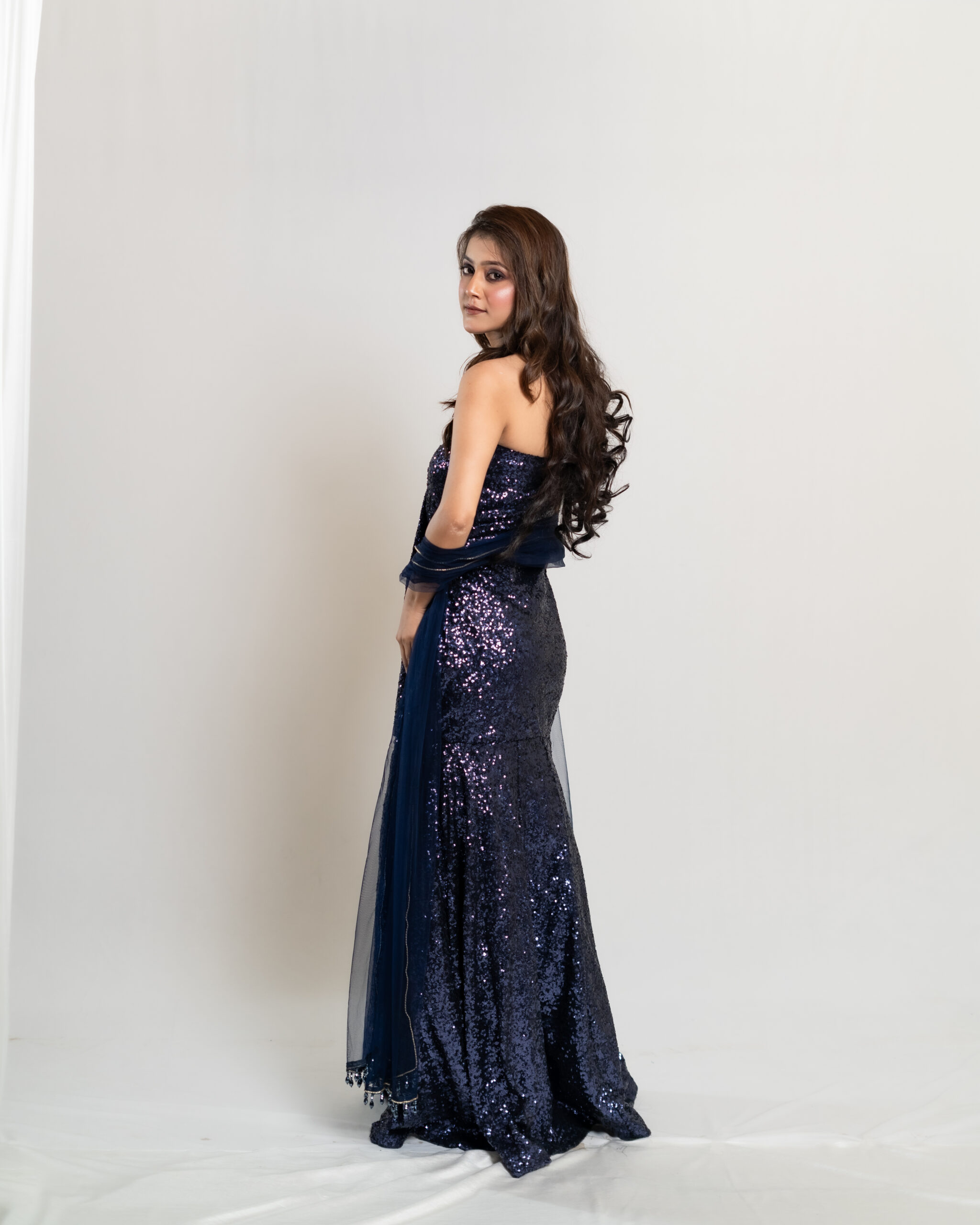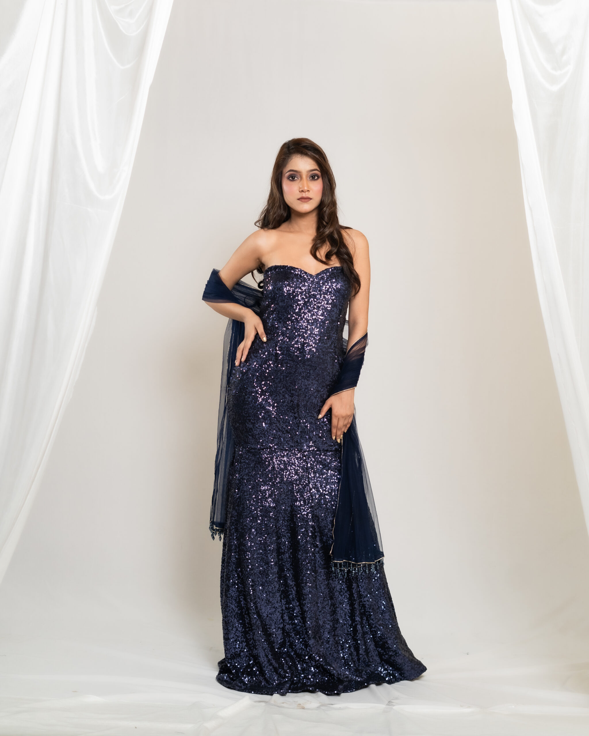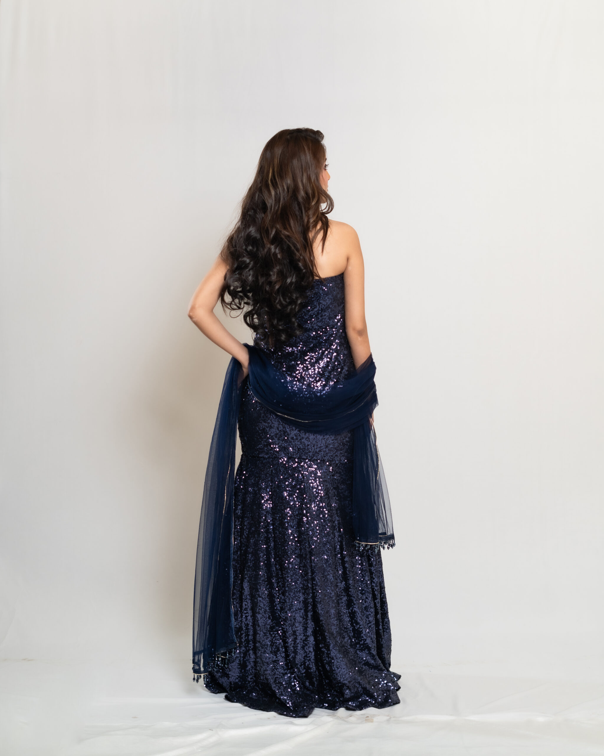 The Starlit Sea Gown captivates with all-over navy blue sequins, reflecting light with every move for a starry-night effect. Ideal for receptions or evening galas. Choose to pair a matching navy blue dupatta with a delicate crystal border to complete the look with flowing elegance and a refined sparkle.