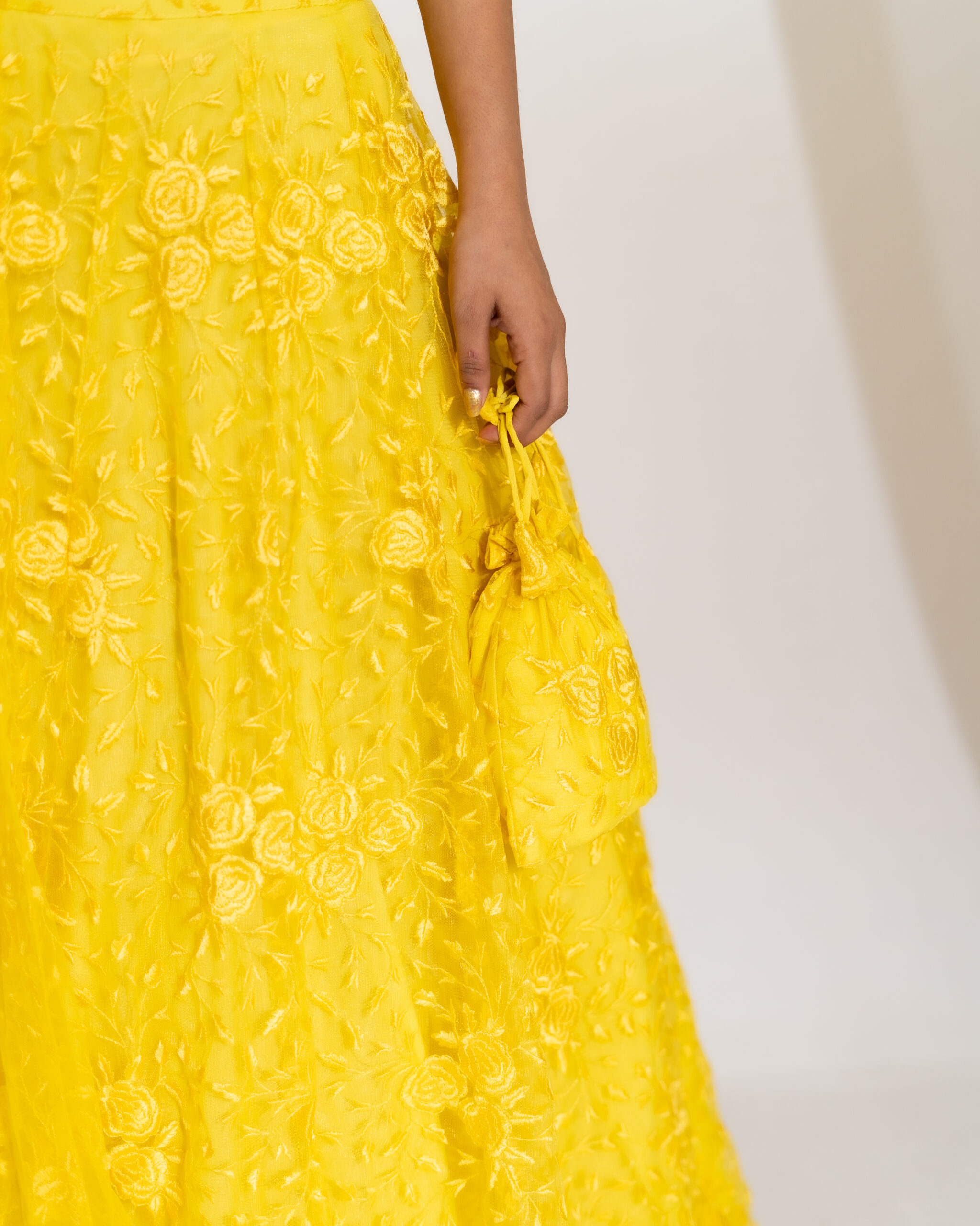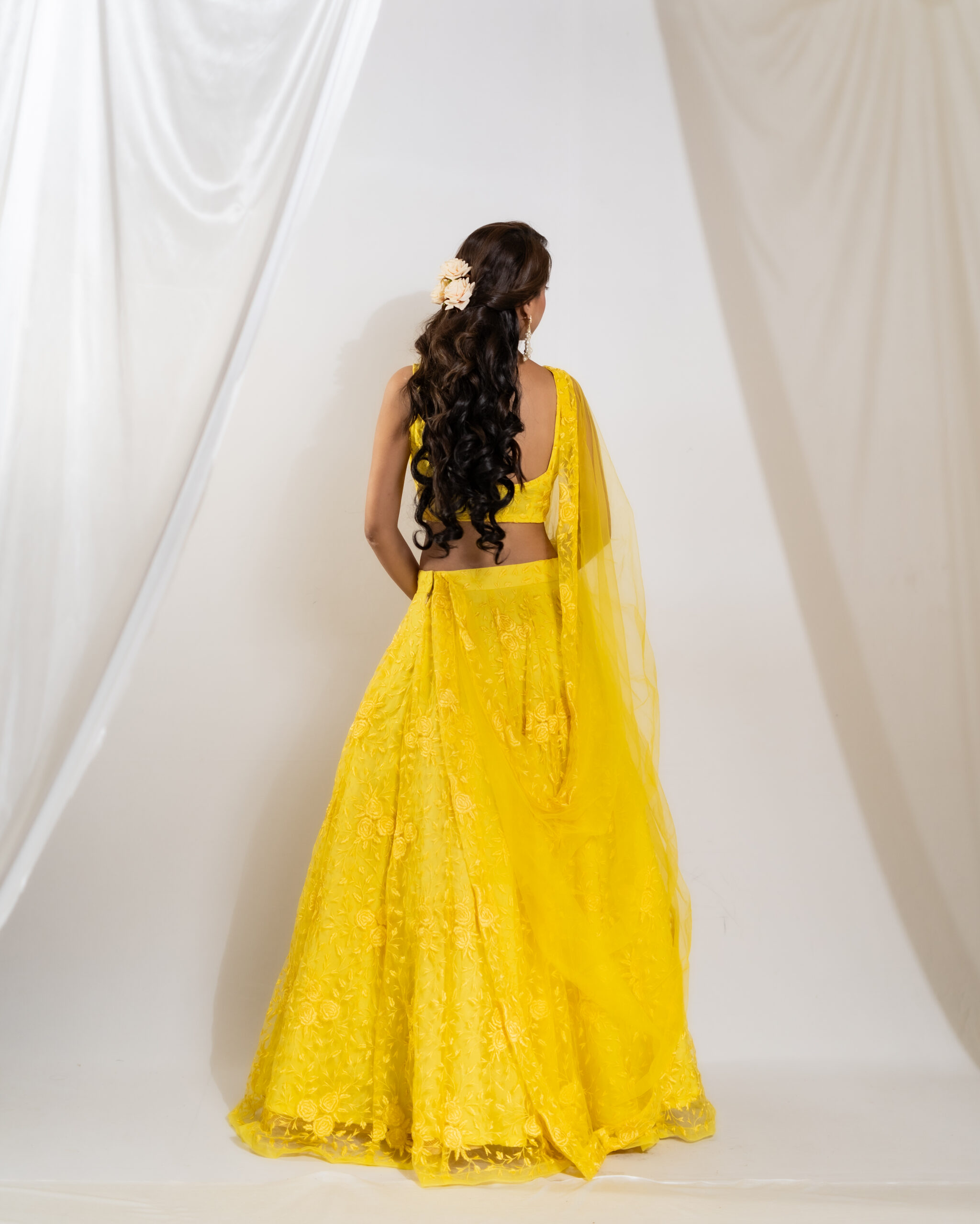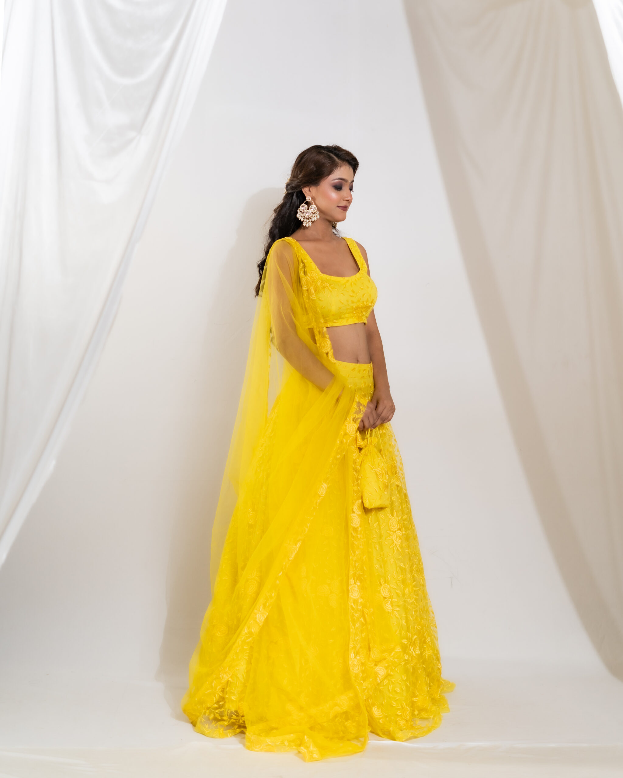 Sunira is a celebration of sunlight woven into fabric. Crafted entirely with intricate threadwork and this vibrant yellow lehenga radiates natural elegance. The set features a structured blouse, a lightweight net dupatta, and a complimentary matching potli. Sunira is the perfect pick for Haldi or daytime festivities, exuding warmth, grace, and effortless charm.