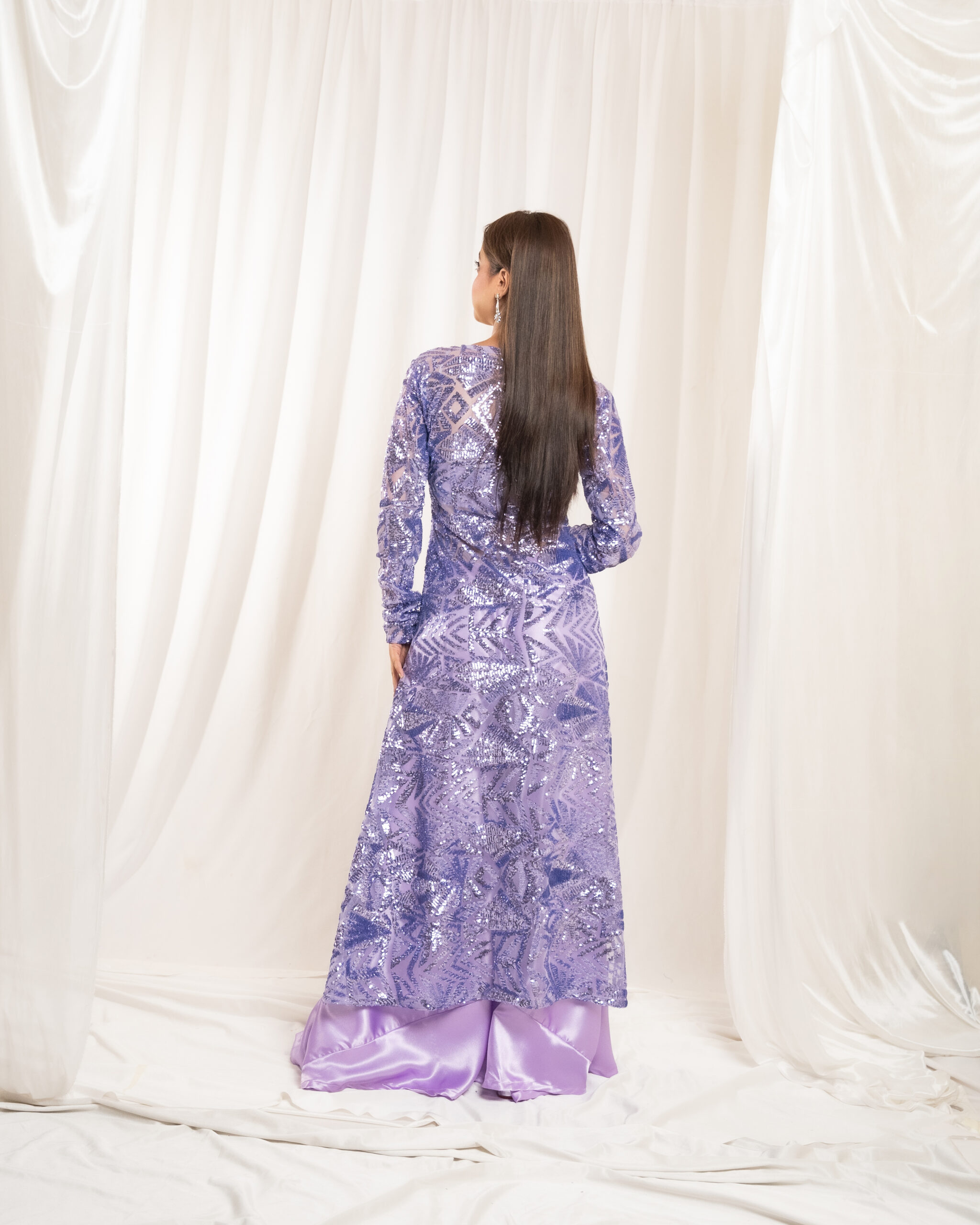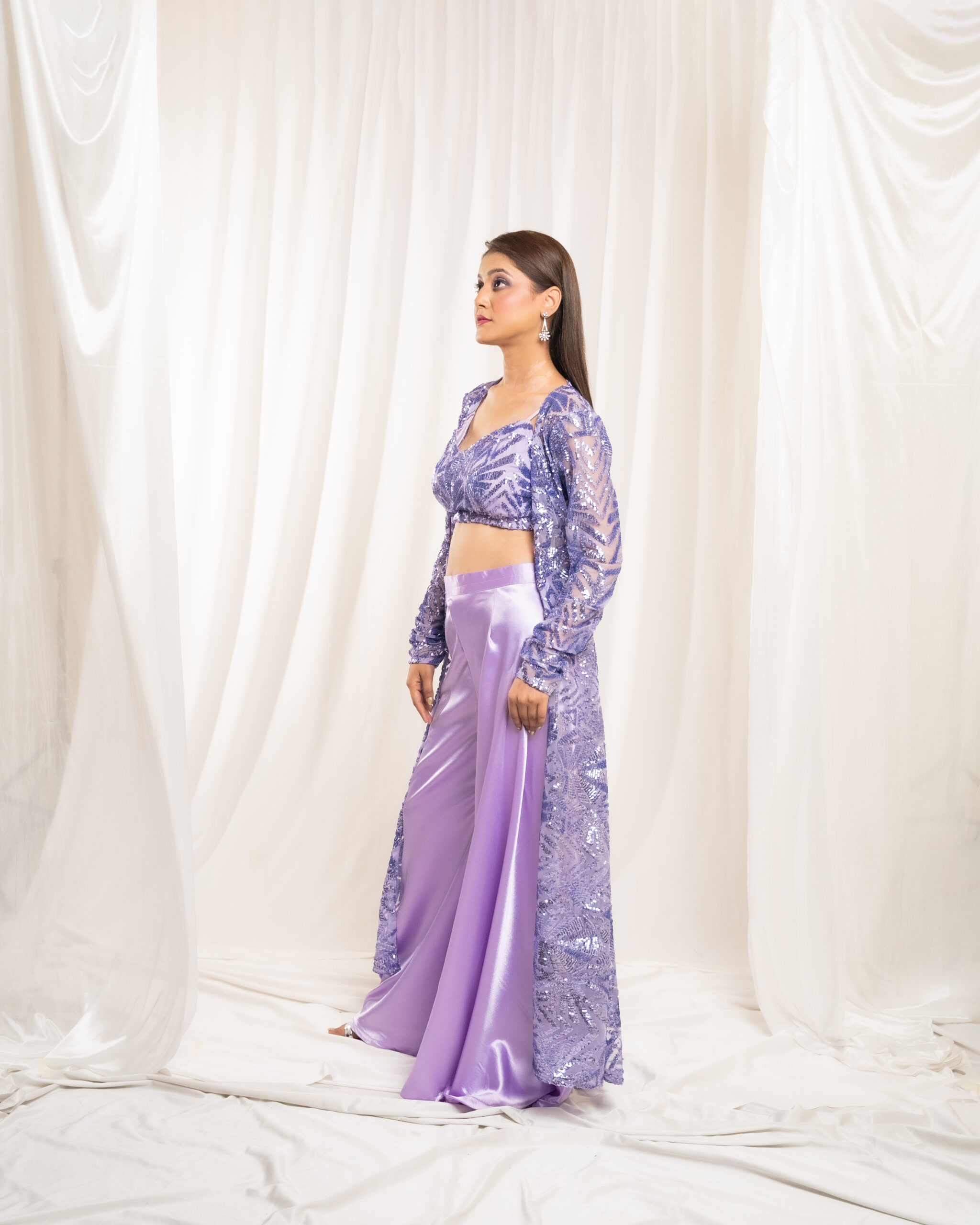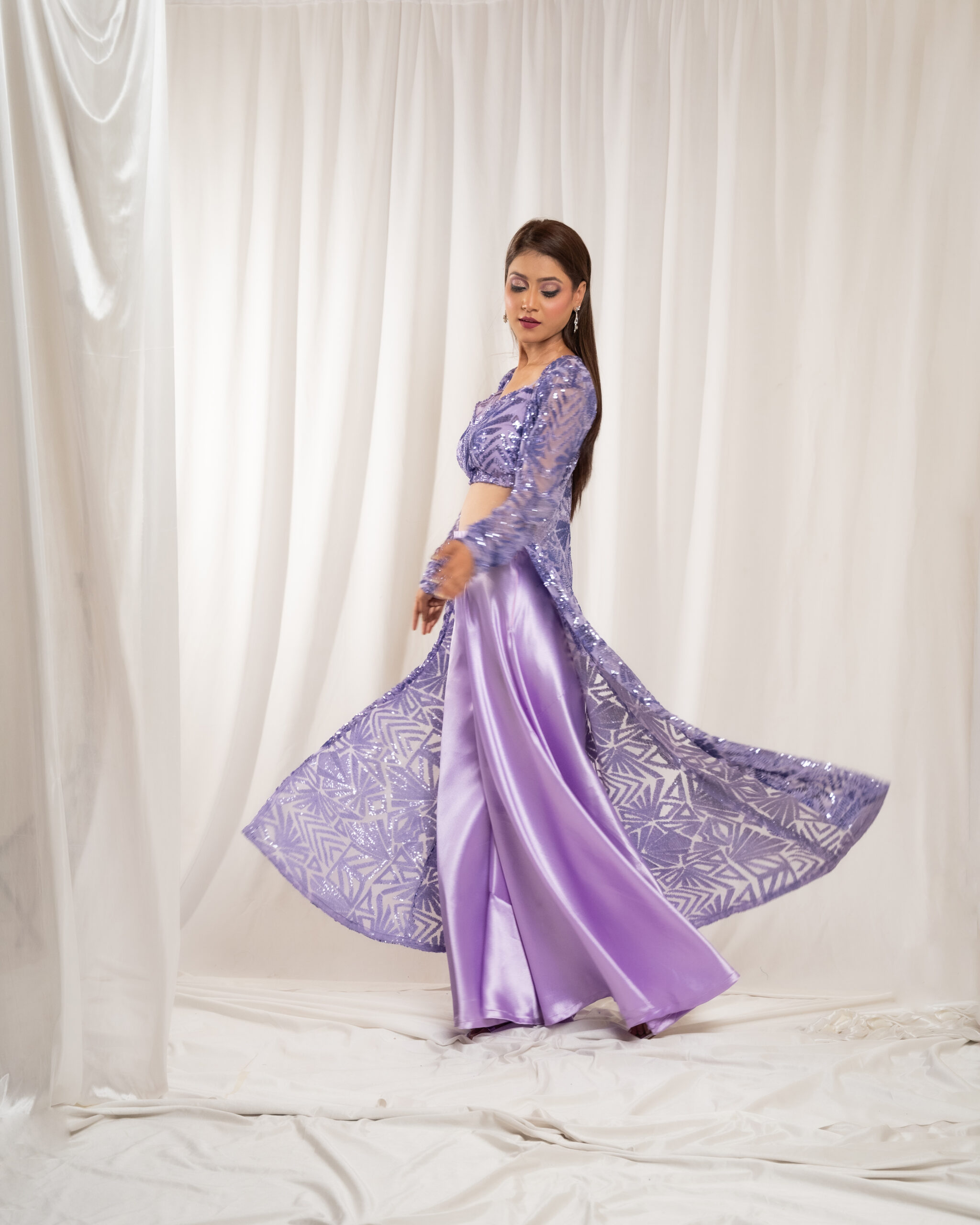 A graceful lavender lilac Indo-Western set featuring a sequin-embroidered top and smooth lavender satin bottoms. Paired with a stunning long shrug with full sleeves heavily embroidered in matching lavender sequins adds a contemporary twist—making this ensemble perfect for stylish celebrations, cocktail evenings, or modern festive occasions.