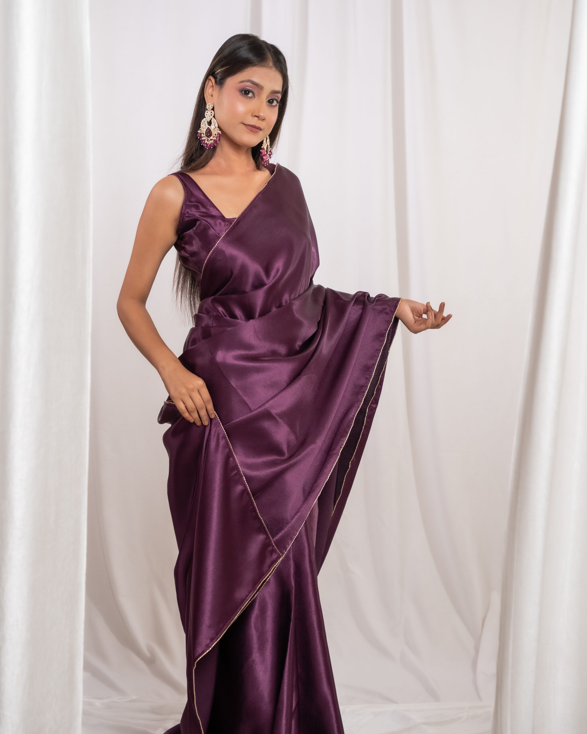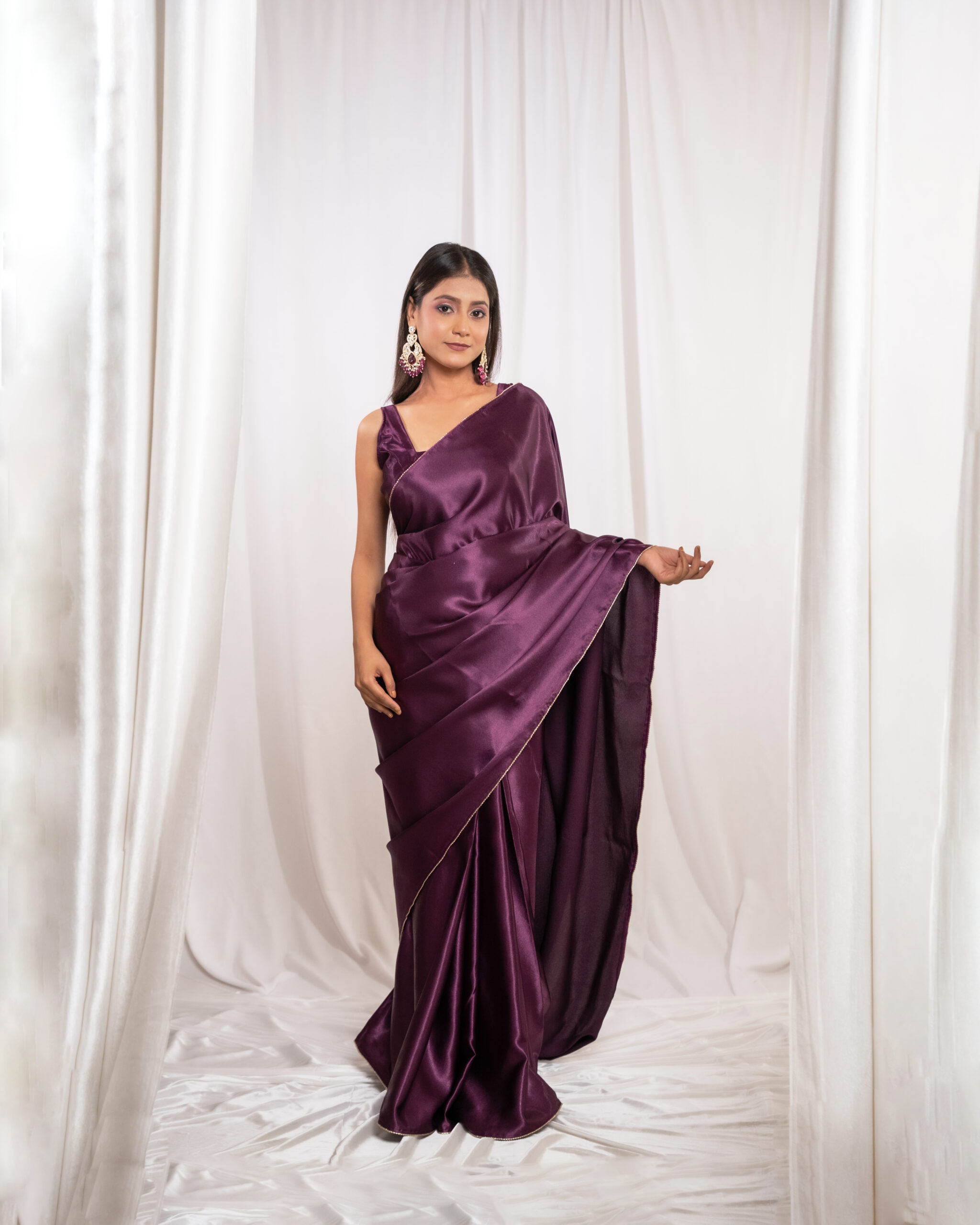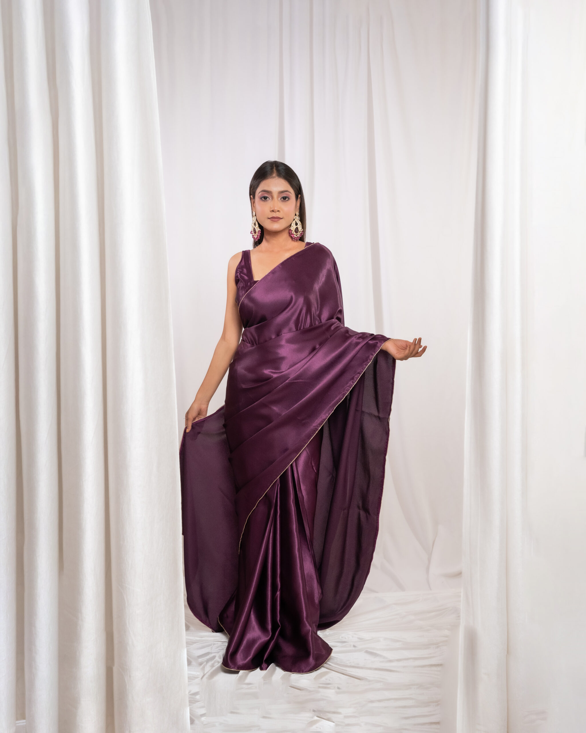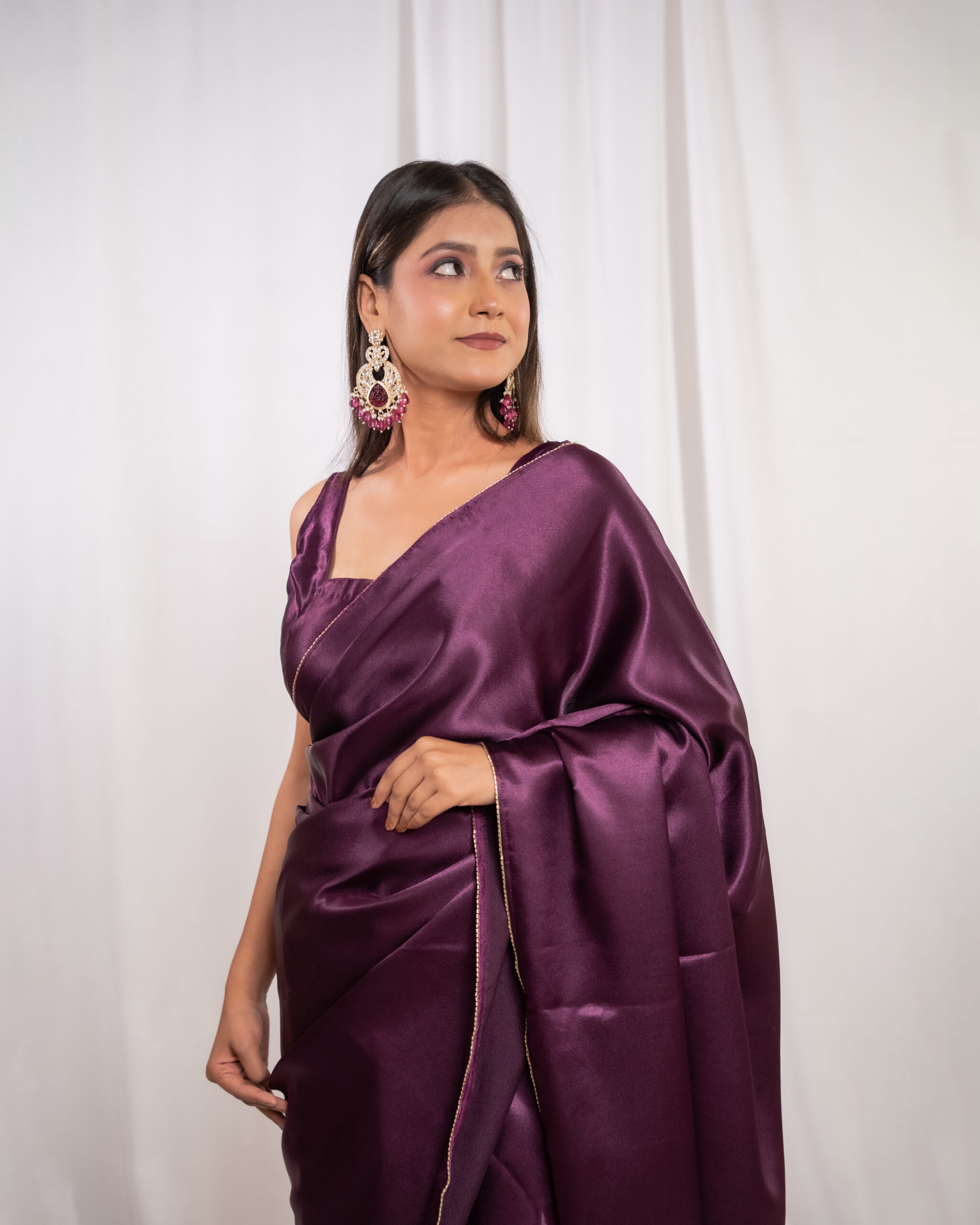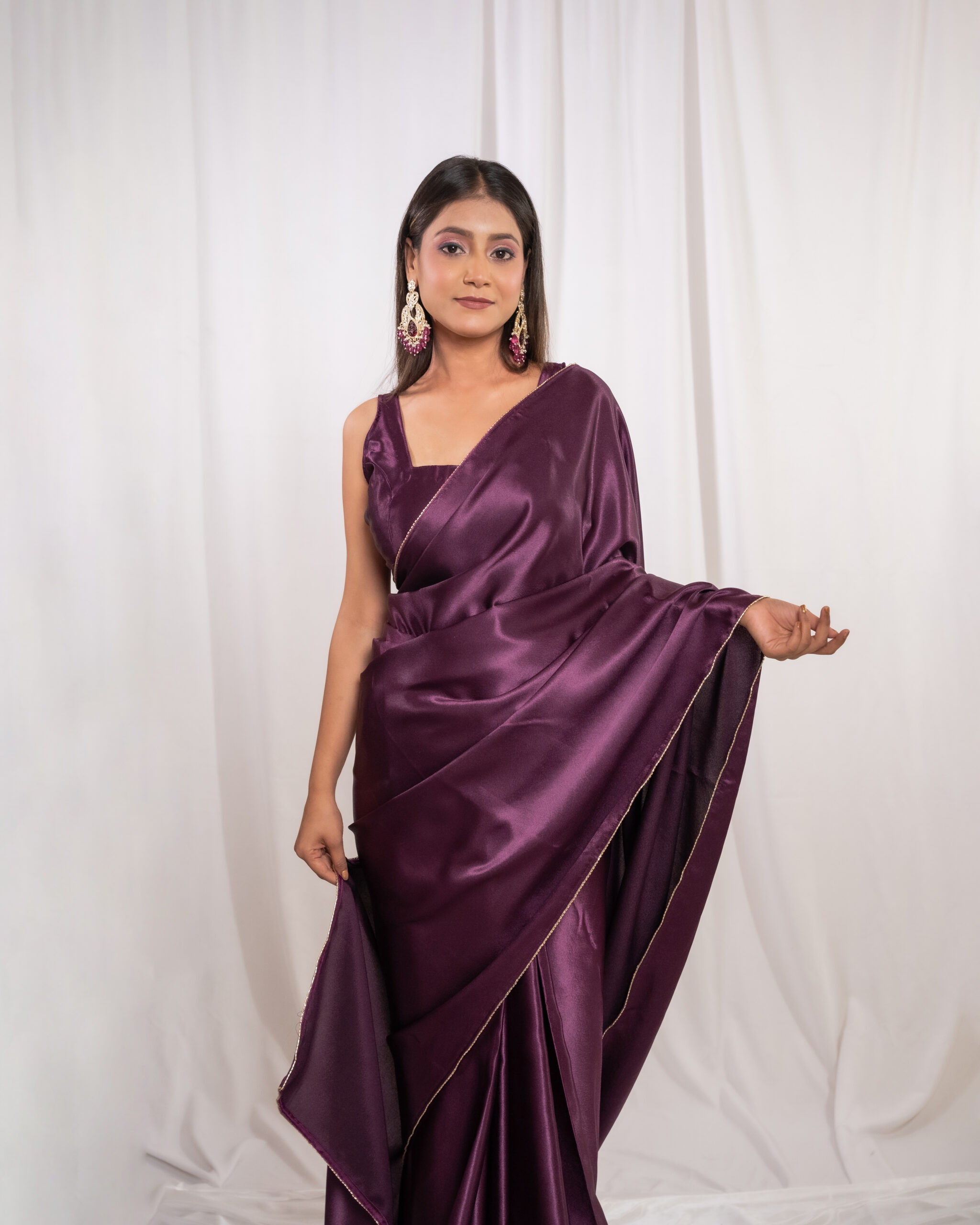 Make a statement in this Wine Silk Satin Saree, featuring gold cut dana work along all borders for a luxurious finish. Paired with a stitched wine silk satin padded blouse available in multiple necklines and sleeve styles, it offers a rich drape, perfect for weddings, cocktails, and festive occasions.