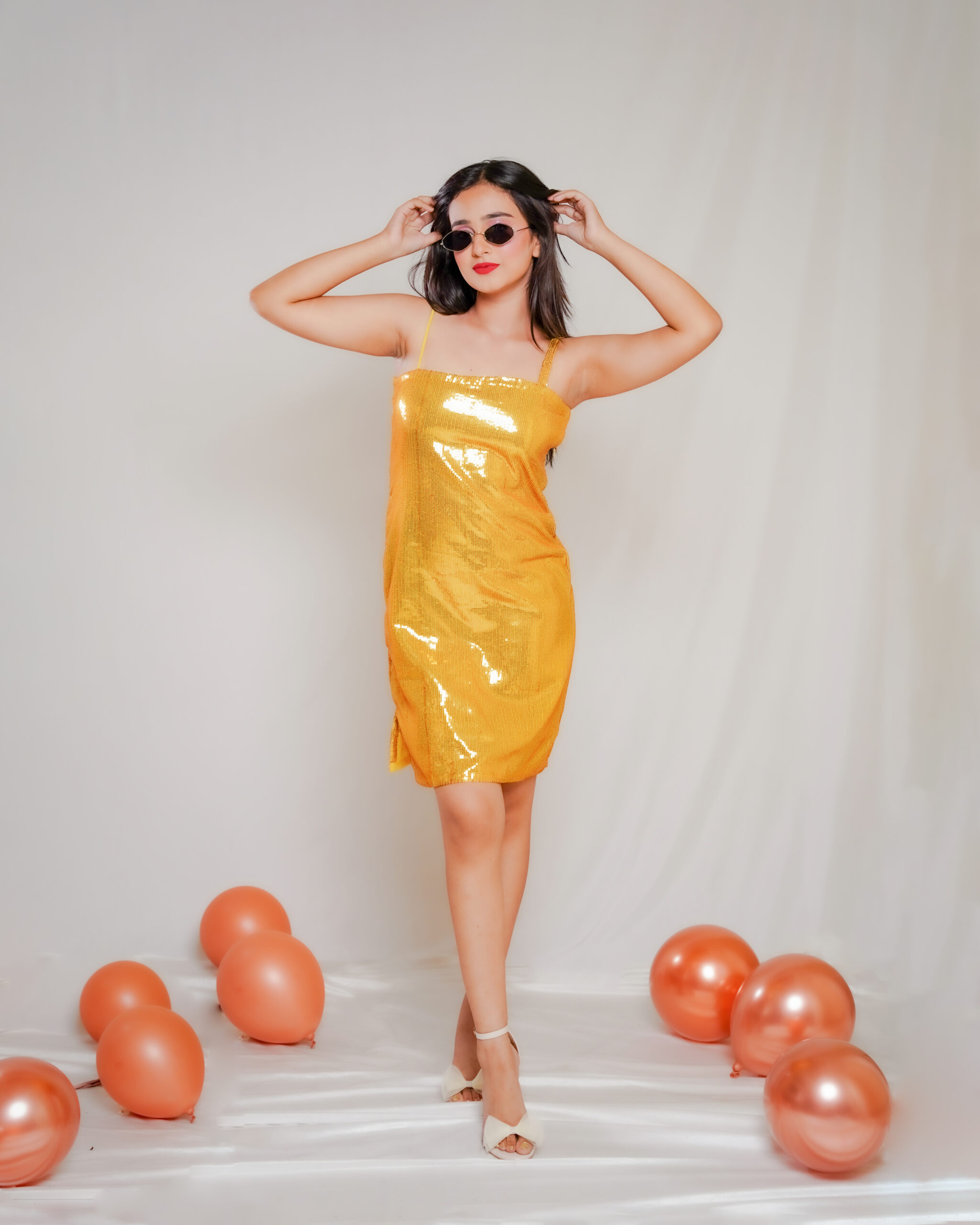 The Yellow Sequin Dress radiates vibrant charm with shimmering sequins, designed to captivate at parties, celebrations, or any event where bold, joyful elegance is desired.