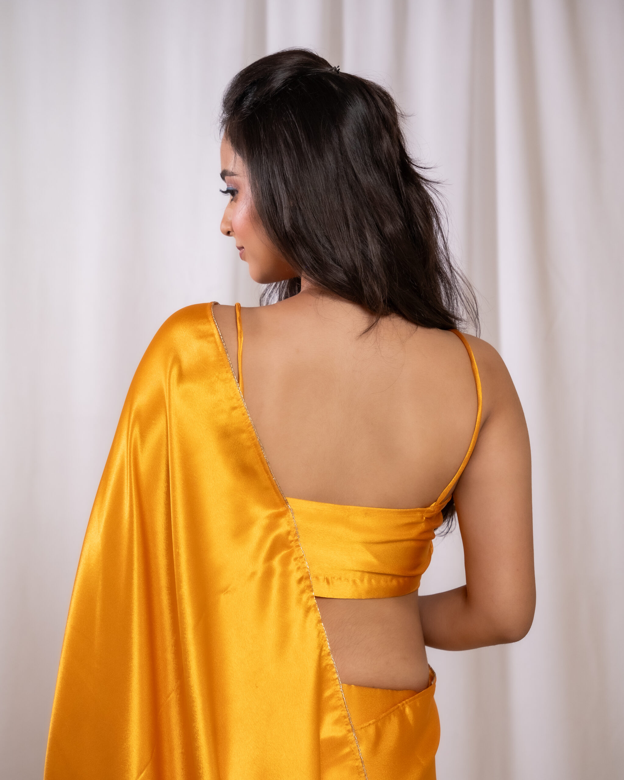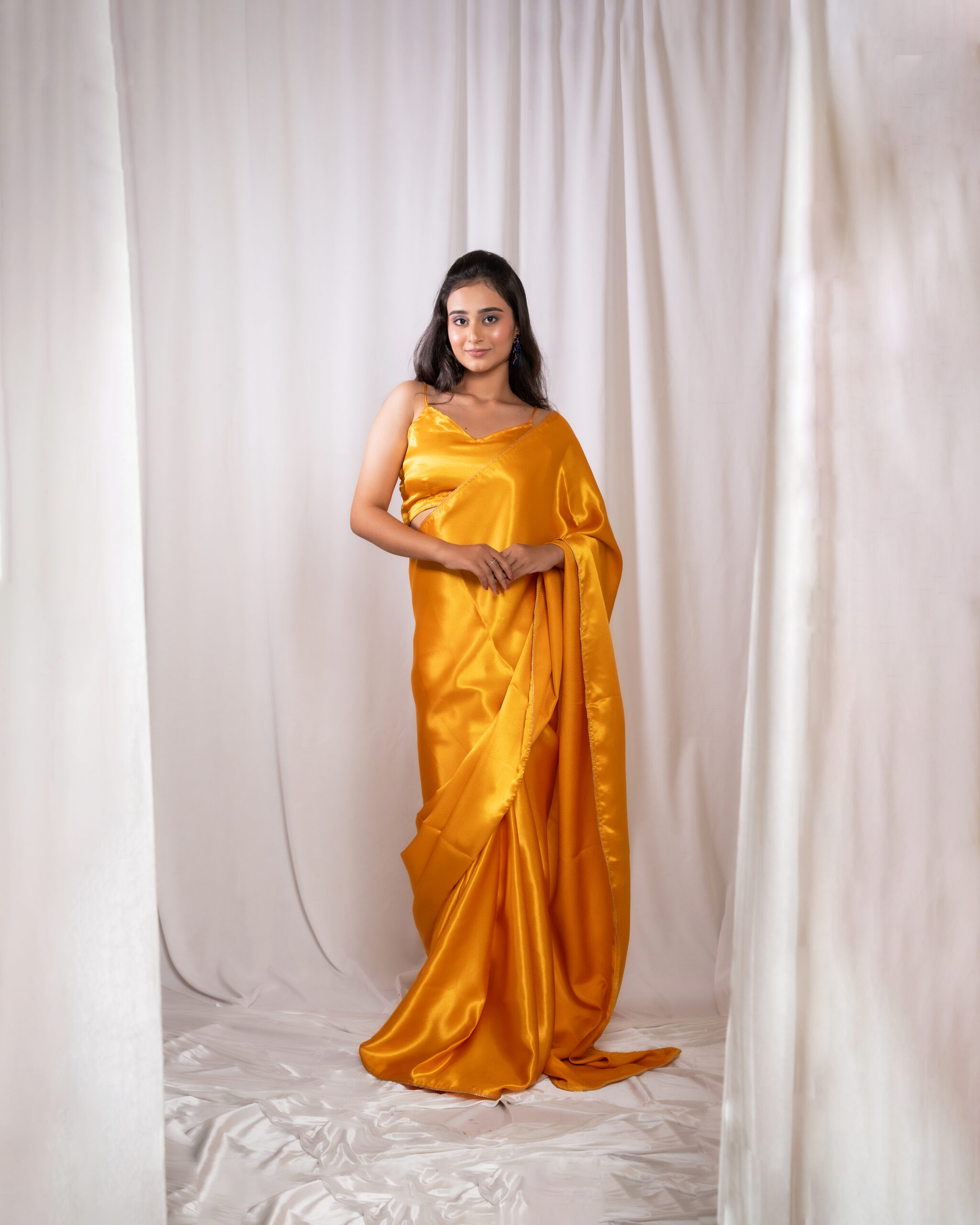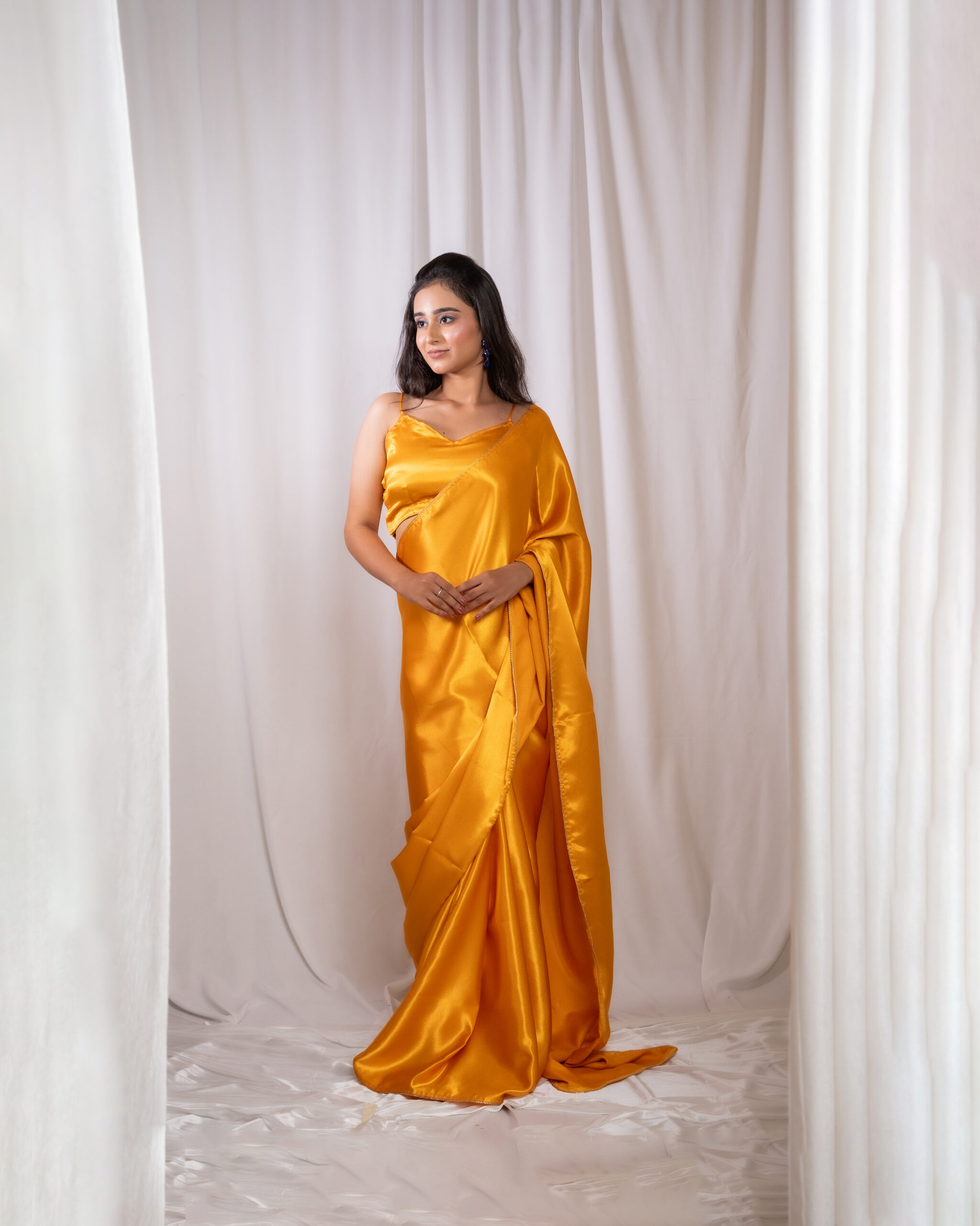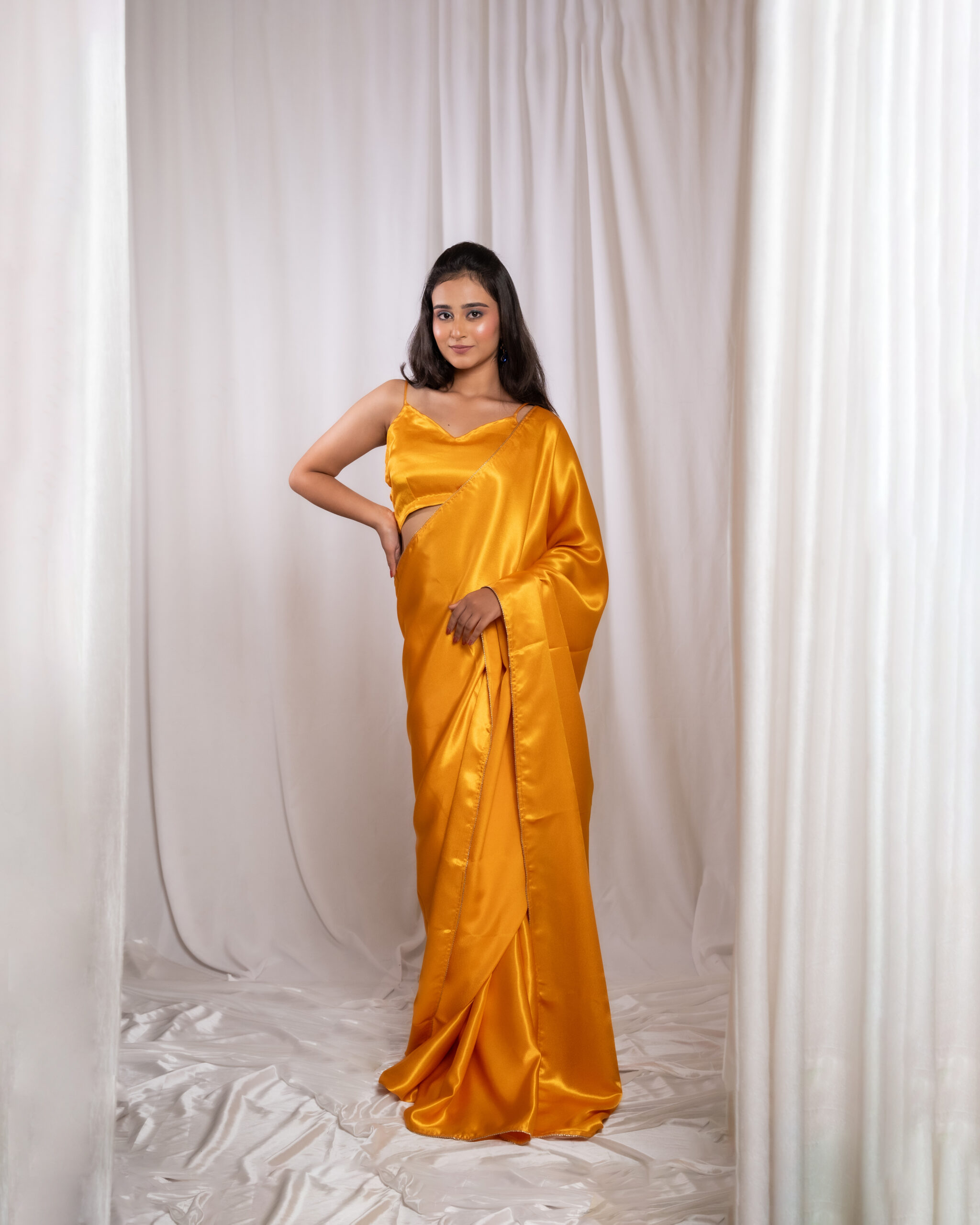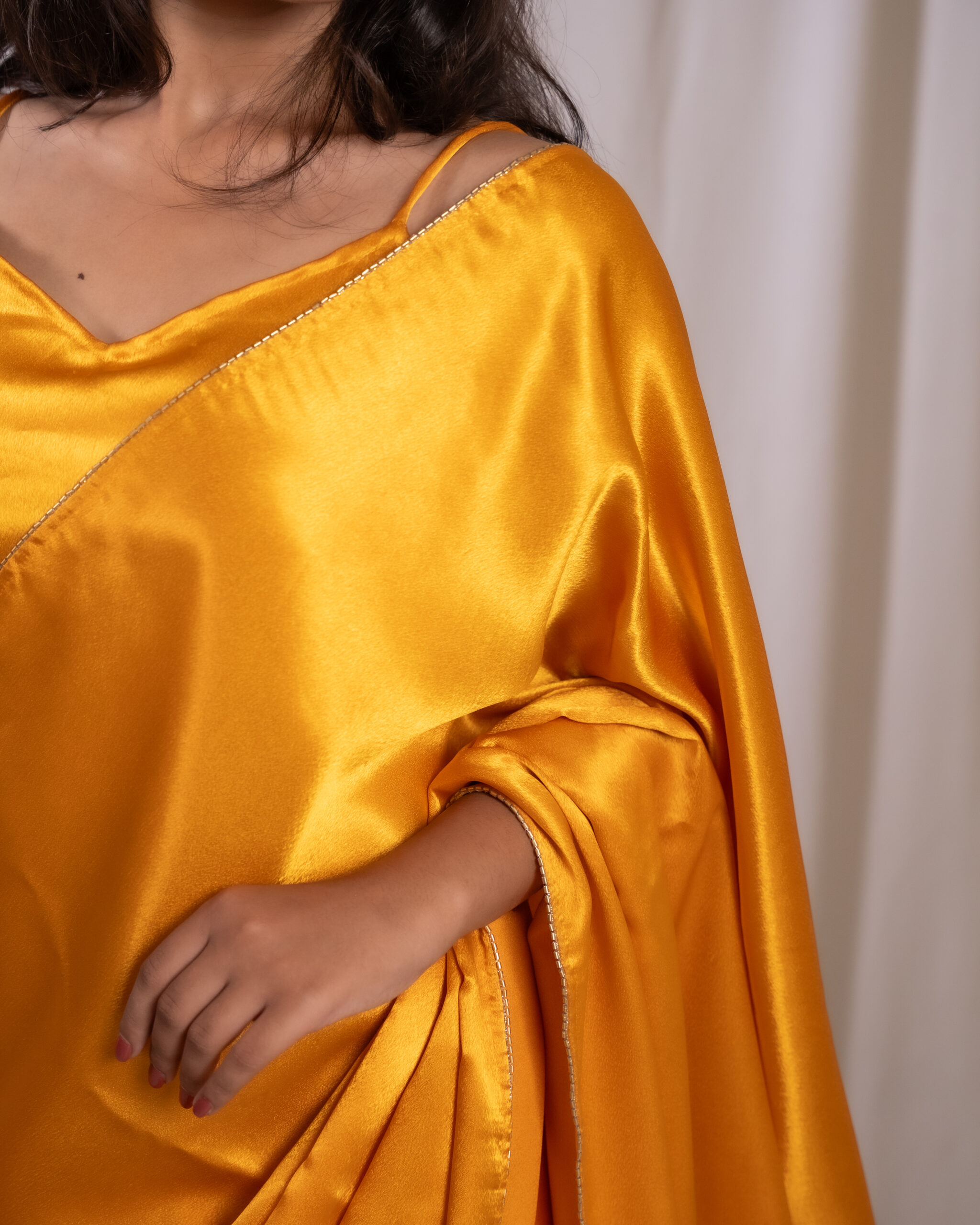 Sunshine meets elegance in this Yellow Silk Satin Saree, adorned with gold cut dana borders for festive flair. Matched with a yellow silk satin , it’s a joyful pick for haldi, pujas, and day weddings.